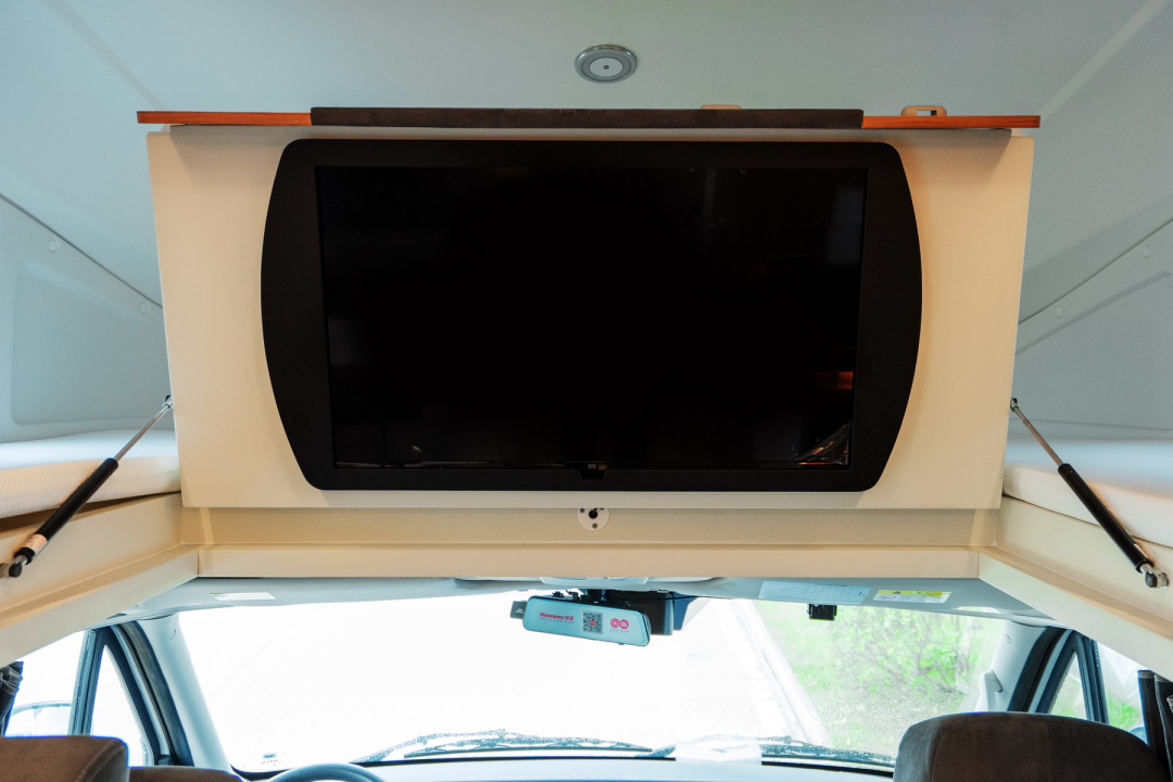 额头床下方内嵌了一台32寸翻转电视,丰富户外生活的娱乐方式。