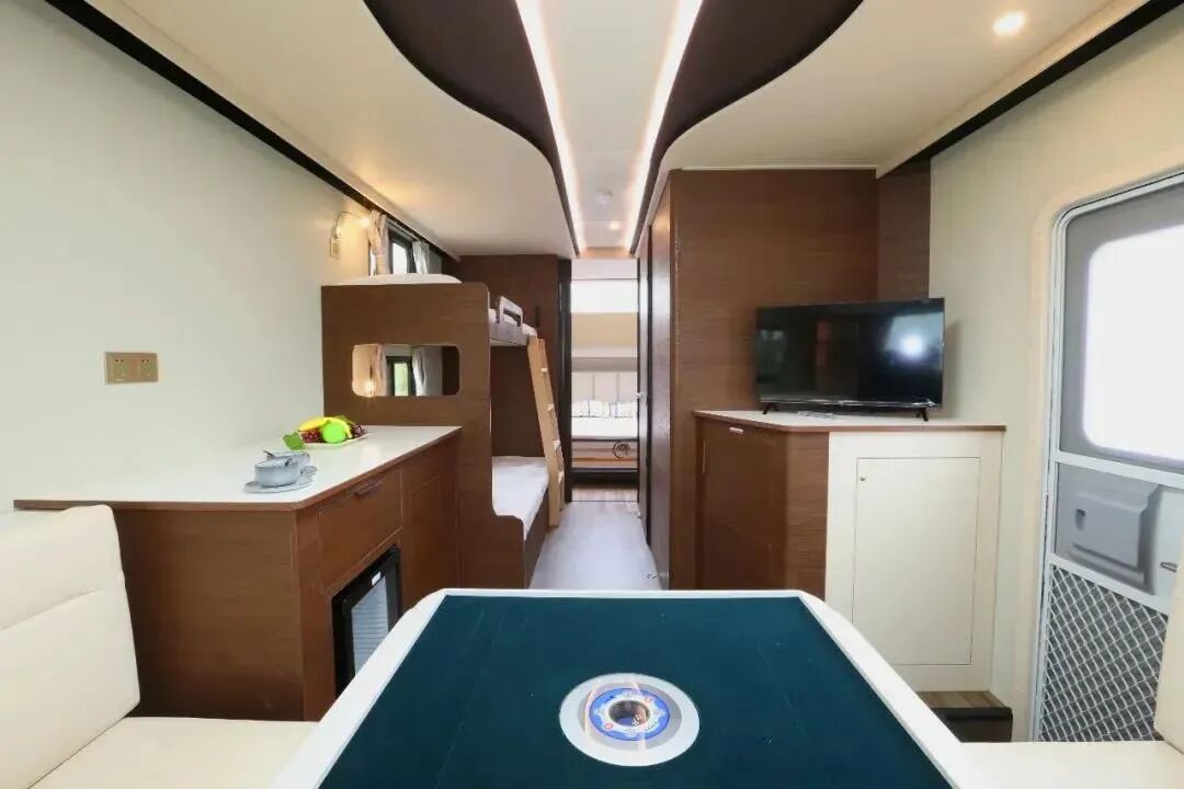 会客区前方,贯通式的走廊一直延伸至头部固定休息区的位置;会客区右前方的位置配置了电视可供日常娱乐使用;左侧设有一张餐桌,桌面可放置日常用品,底部为多种抽屉、储物柜可满足日常储存物品的需求;