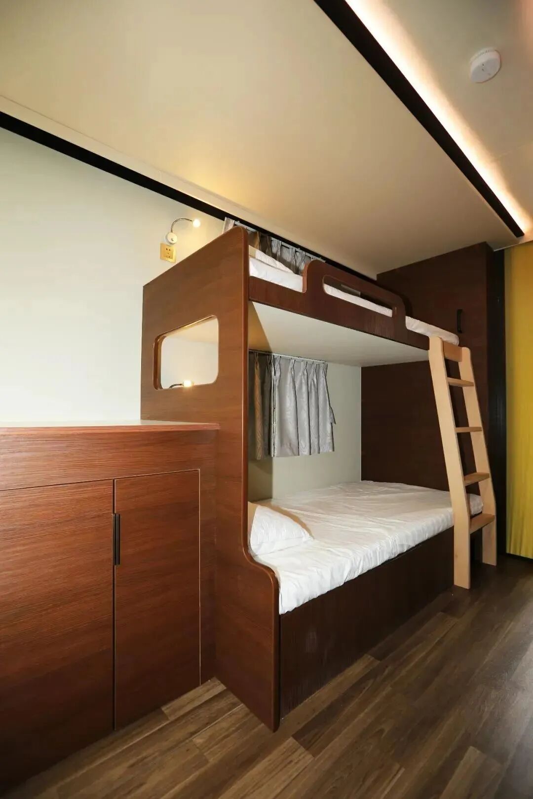 贯通式走廊中部左侧的位置纵向放置了一张上下铺,睡眠空间充足,满足多人睡觉的需求;同时上下铺侧方的位置分别配有阅读灯;