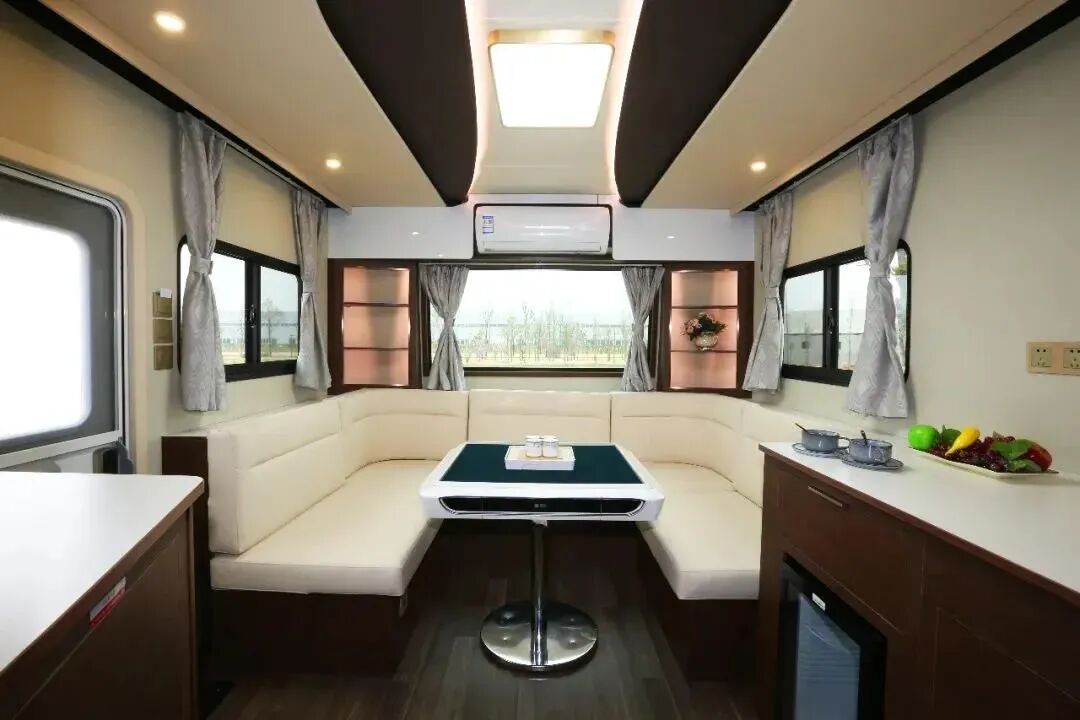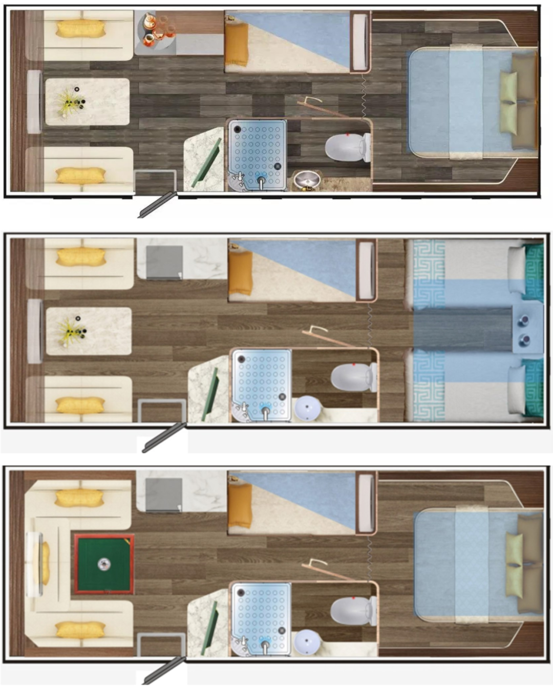 这款房车共有三款内饰布局可供选择,从上至下依次为双人床布局、双床布局、麻将桌布局,本次带大家看的便是麻将桌布局的内饰;得益于超长的车身,整车内部空间相当充足,功能区规划亦很合理,配置齐全,对于日常生活、休闲、娱乐、休息等各项需求可充分满足;