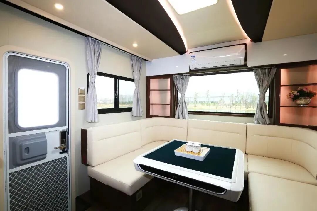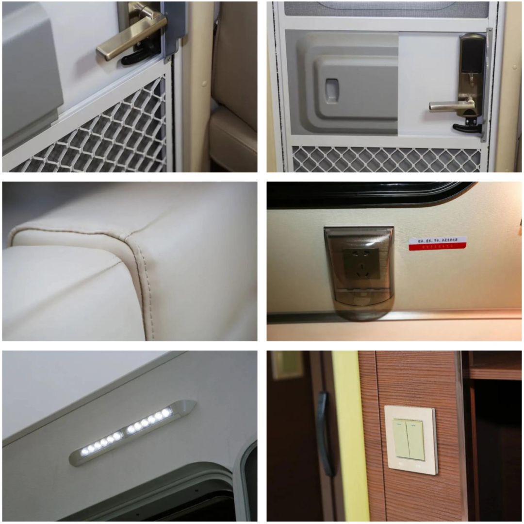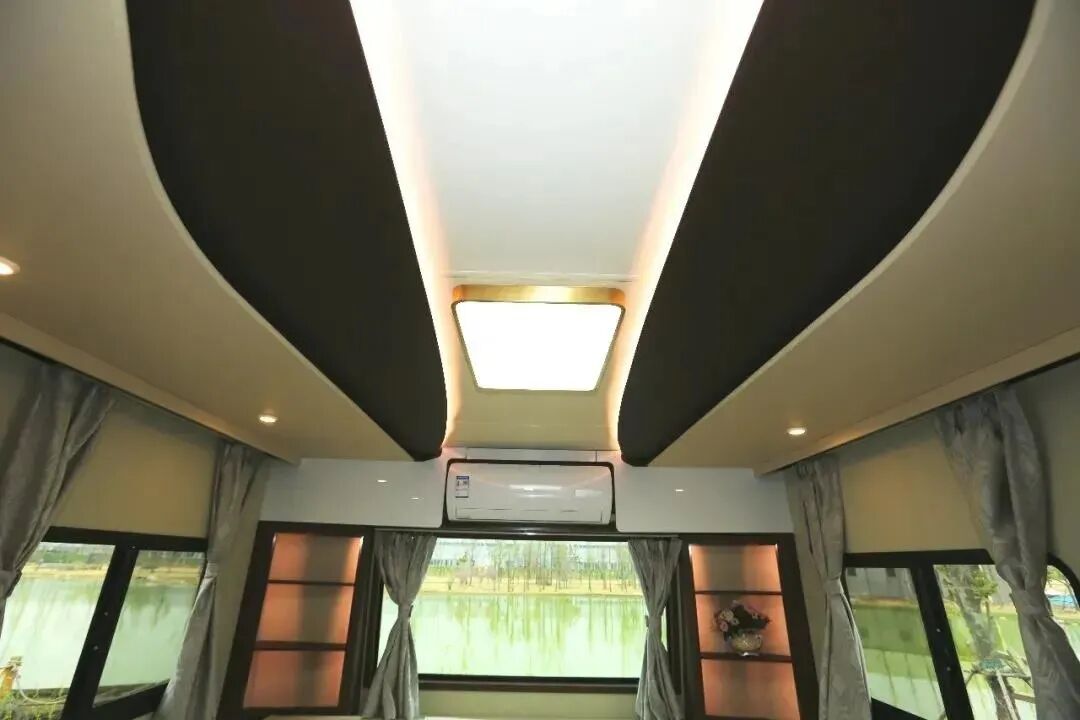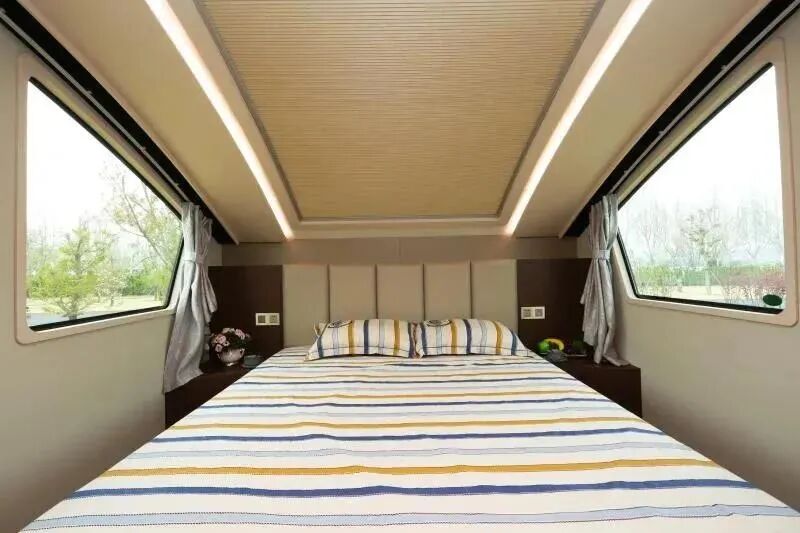 车身头部固定休息区配置了一张双人大床,另可根据个人需要更改为2个单人床;头部设有床头柜方便放置生活用品;多个带有USB的插座可在夜晚睡眠时给手机、平板电脑等电子产品充电;两侧各设有一个观景窗,面积达1.4平米,窗外景色一览无余;此外,双人床顶部还设有一个面积为2.5平米的弧形天窗,夜晚躺在床上,欣赏着夜晚的星空,感觉相当的惬意;另外,为保证通风效果,整车设有7个外推窗,充分满足车内采光、通风的需求;