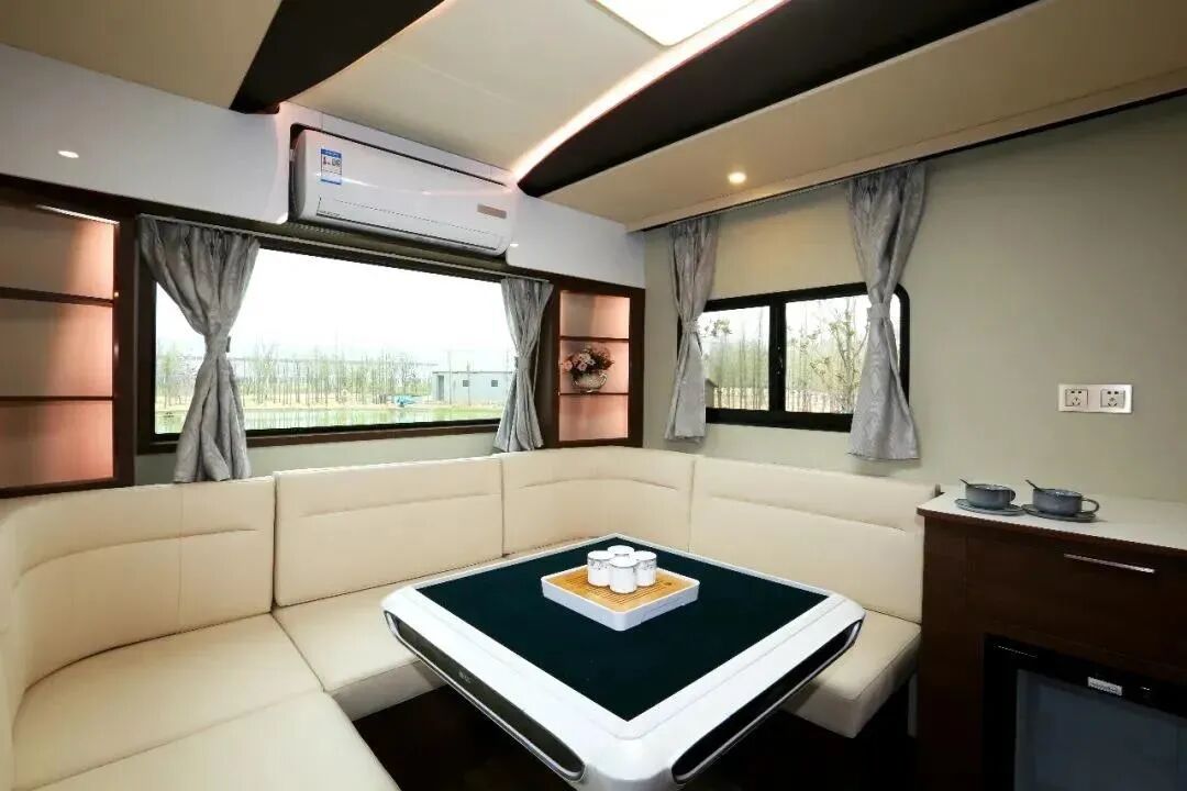 尾部会客区选用皮革材质的环绕型卡座沙发,乘坐体验相当舒适,同时也便于日常清洁工作的进行;卡座中间位置搭载一张麻将桌,可供日常休闲娱乐使用;会客区四周设有多个外推窗,满足日常采光、通风的同时,用于观赏外部景色亦有不错的体验;车窗内部均设有窗帘可用于保护个人隐私不受侵犯;