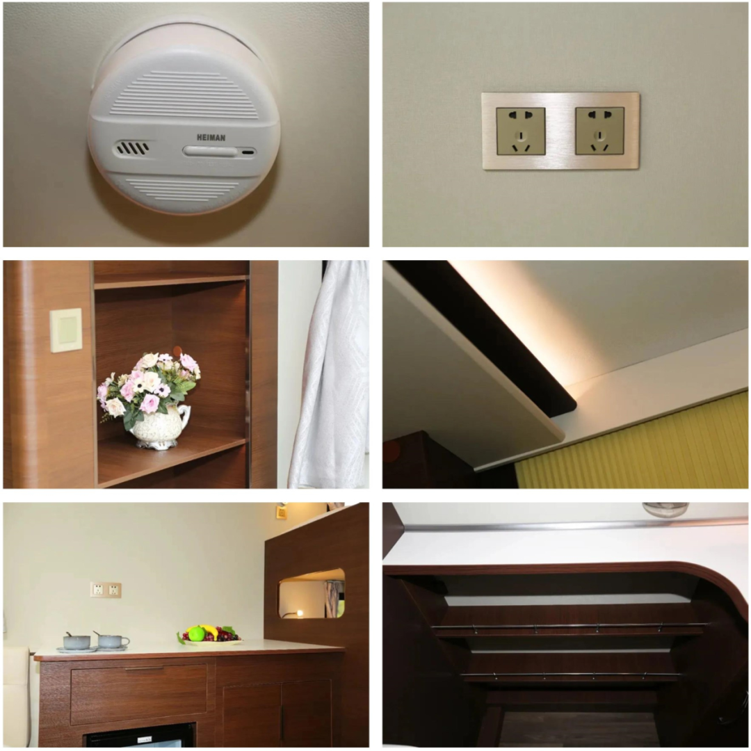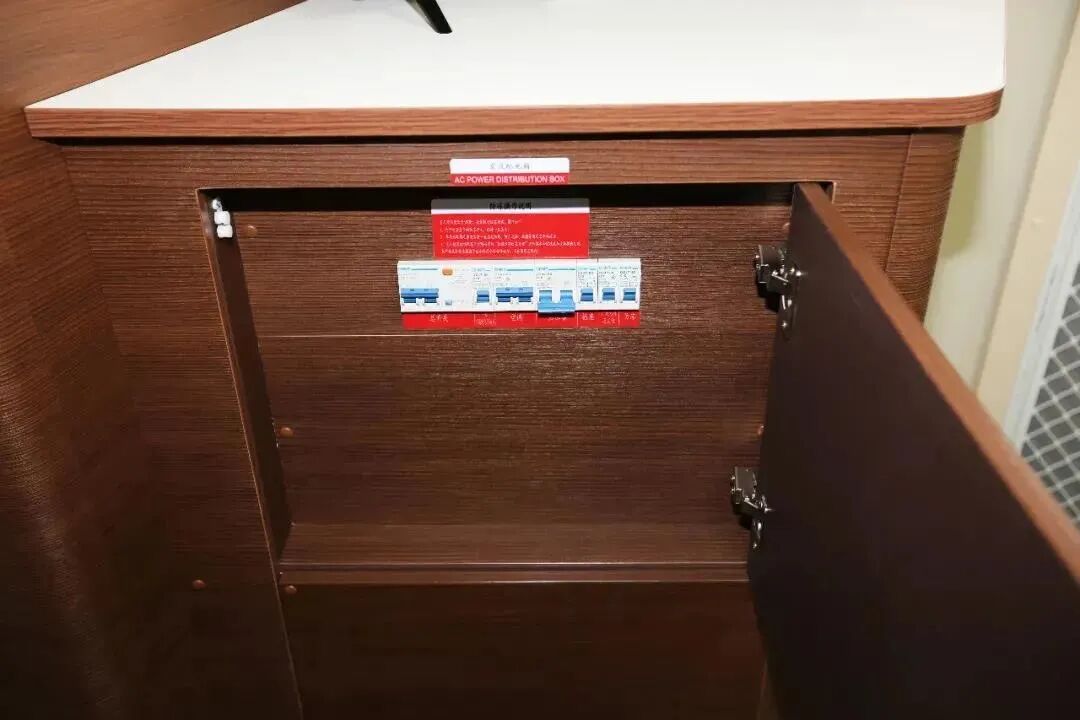 电视下方橱柜设有隐藏式总控区,机械式开关,简单操作即可控制车内水电等设施;