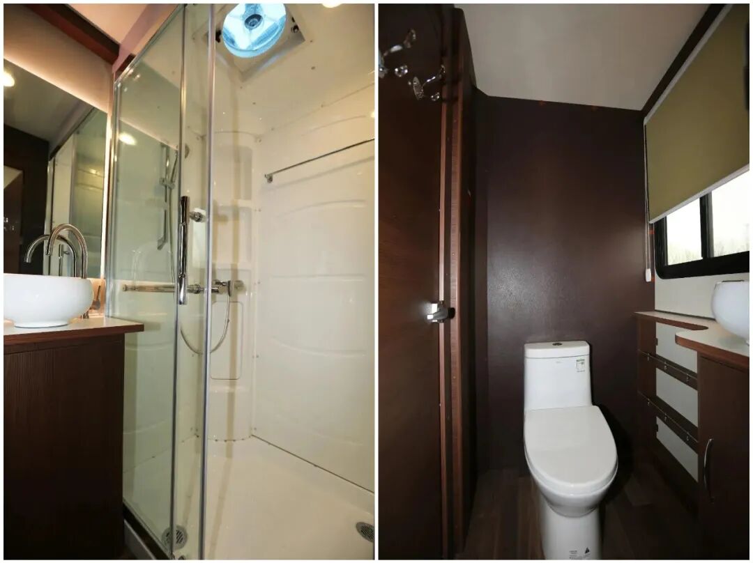卫浴间位于车内中部右侧的位置,采用干湿分离式的设计,有效避免洗澡后地面总是湿漉漉的,日常使用更加的舒心;内部配置了陶瓷马桶、洗漱池、储物柜、浴镜、浴帘、毛巾架等设施,满足日常洗漱的需求;同时还搭载了一台60L的电热水器供洗澡时使用;