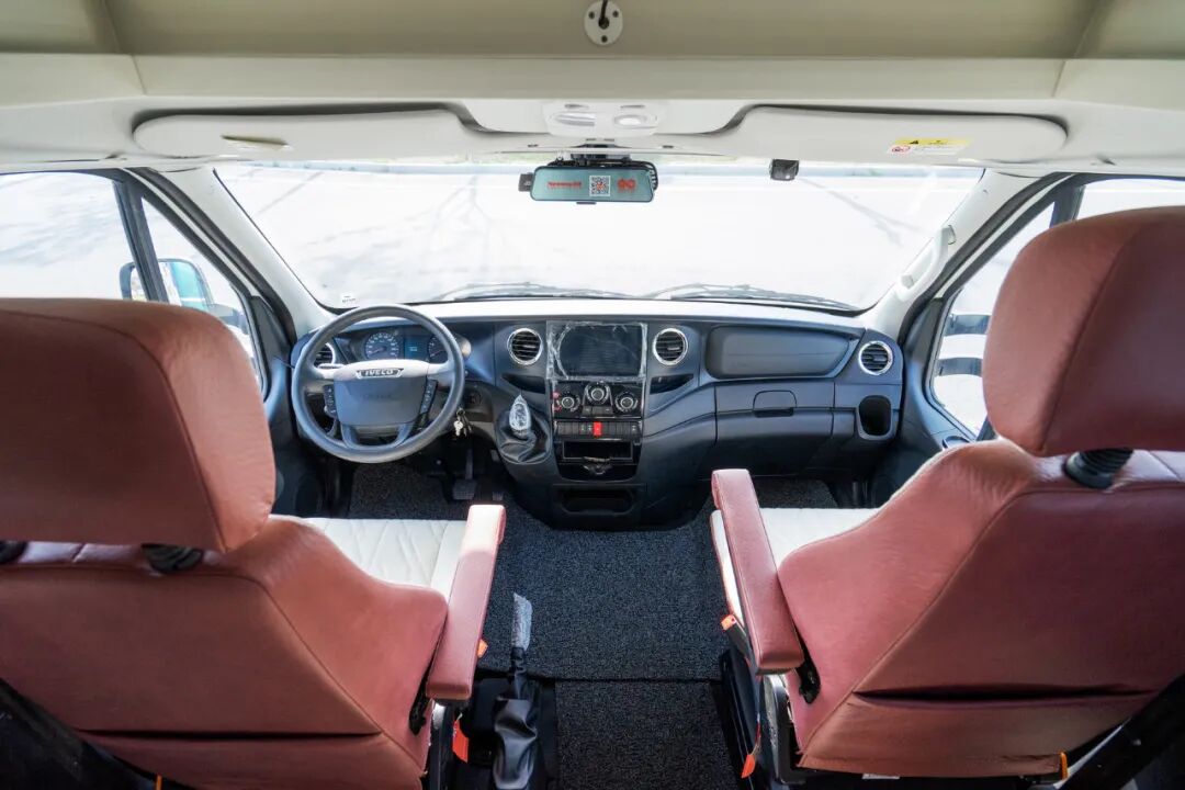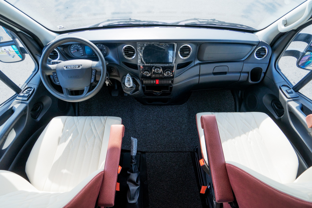 驾驶室主副驾驶座均配备悬浮座椅,可有效缓解久坐疲劳,副驾驶座椅还可以180°旋转,方便与后方空间交谈聊天;行车方面配有 主/副驾安全气囊、胎压监测、多功能方向盘、ABS、ESP9.3、LDWS、定速巡航、电动加热后视镜、前后行车记录仪、导航倒车影像系统等。