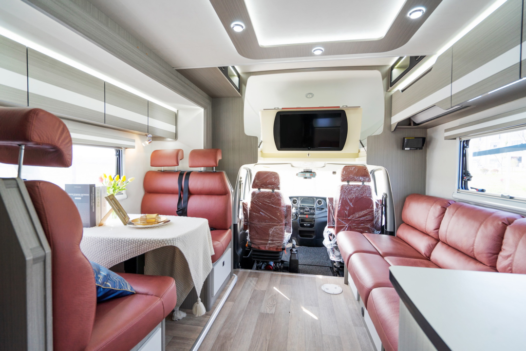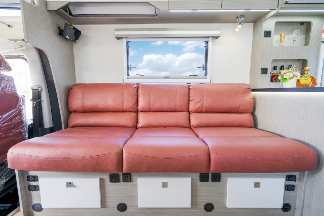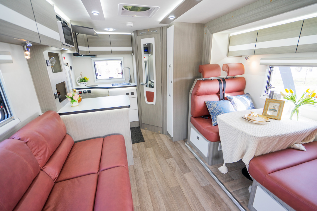 生活空间方面,由于采用尾置厨房区的布局,会客区拥有更大空间,在设置了对坐沙发的同时,还设有长条沙发和吧台,提升了空间利用效率;内饰采用酒红色沙发和浅灰色木纹板材搭配,更显高雅华贵;车内还设有暖风系统、热水系统,为旅行生活提供方便。
