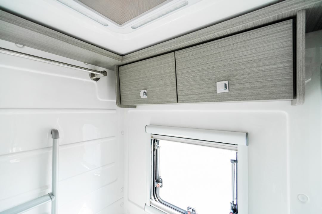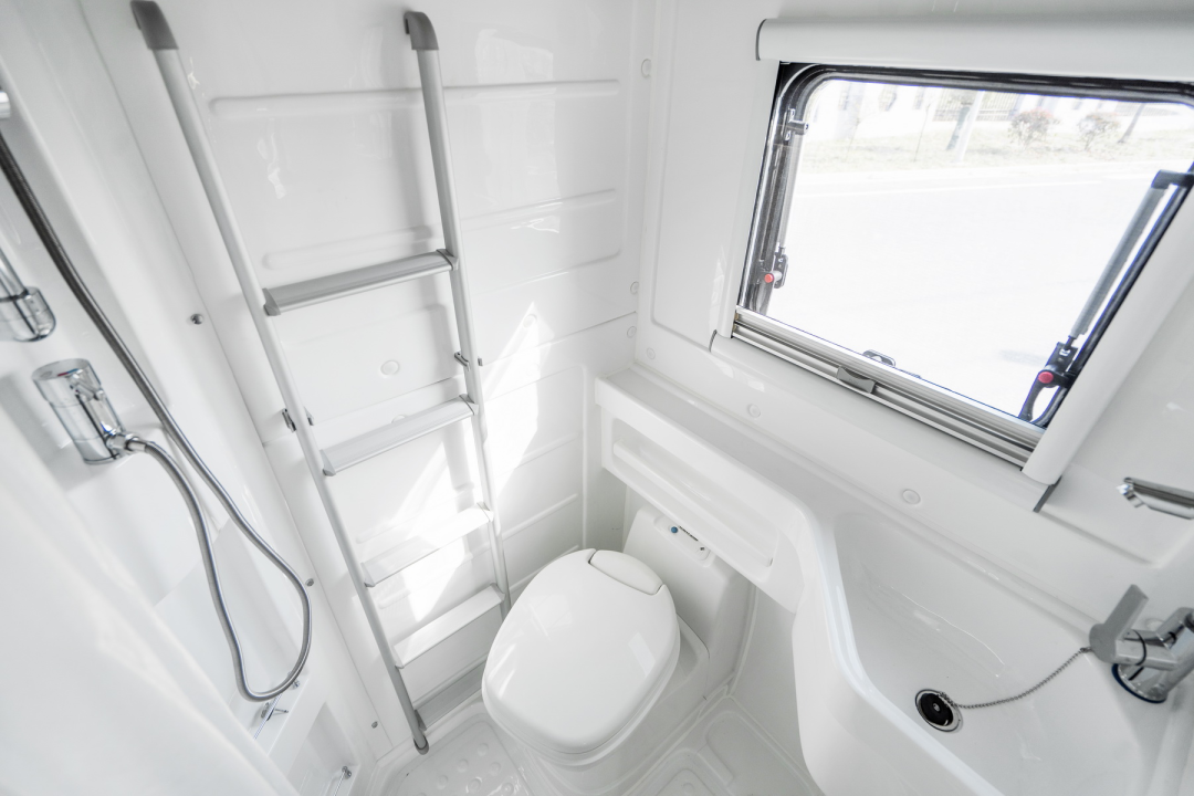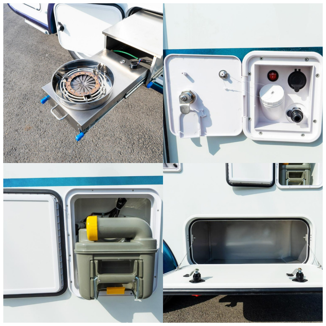 车身外侧配备了3.5m户外遮阳蓬、抽拉式灶台、防风煤气灶头、房车专用气瓶(带固定装置)、户外插座、电动伸缩踏步等户外生活设施;车厢采用三明治玻璃钢结构,保温、隔音、隔热性能出色。