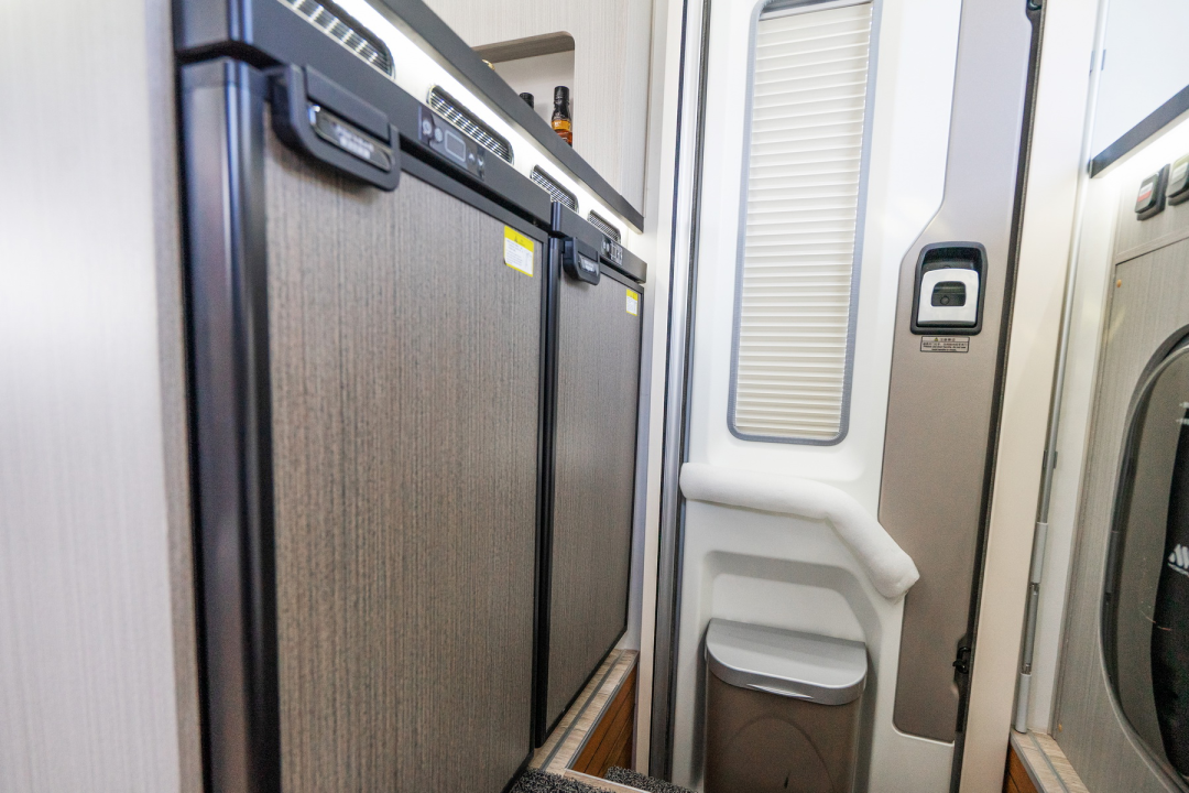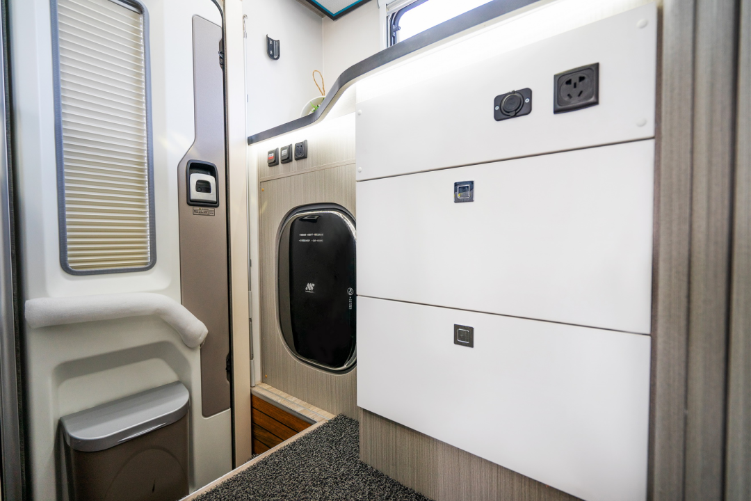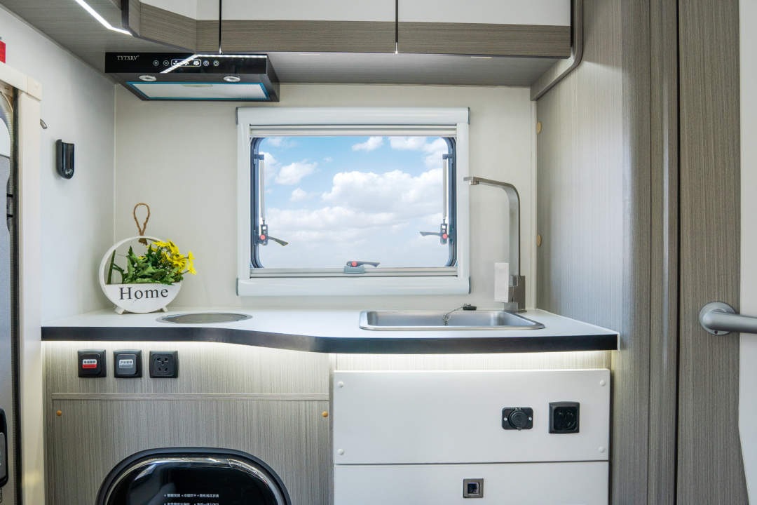 下方配有一台洗衣机,解决旅行洗衣问题;右侧是分层式储物抽屉,收纳碗筷餐具等厨房用品。
