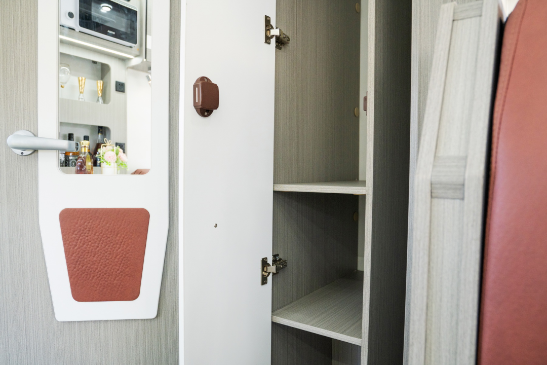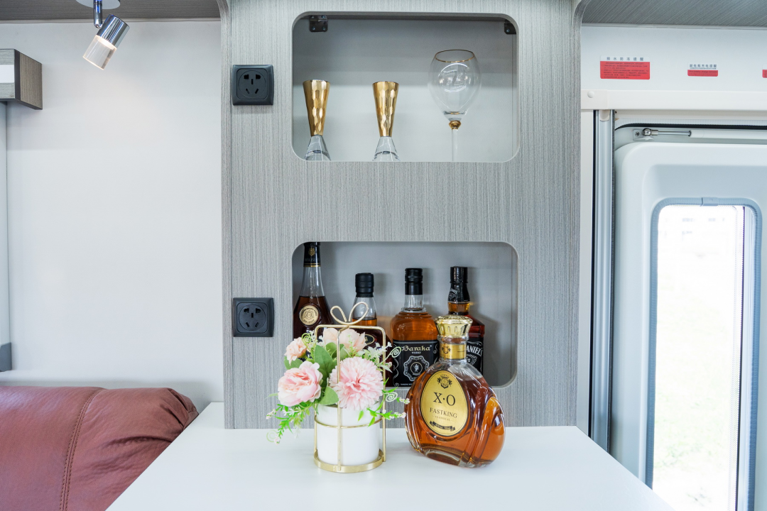 会客区后方是厨房区,由吧台和橱柜两部分组成;吧台位于长条沙发后方,设置了红酒、酒杯储物格,为旅行生活增添氛围。