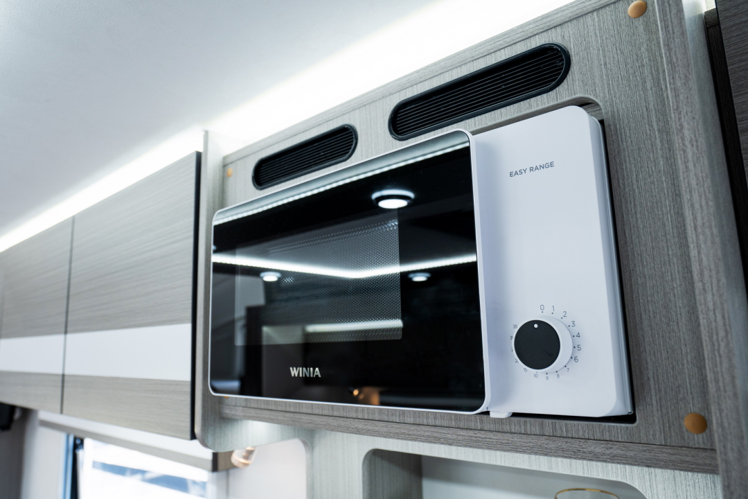 顶部设置了微波炉,方便快速加热食物;侧面设置了L型吊柜,收纳厨房所需物品。