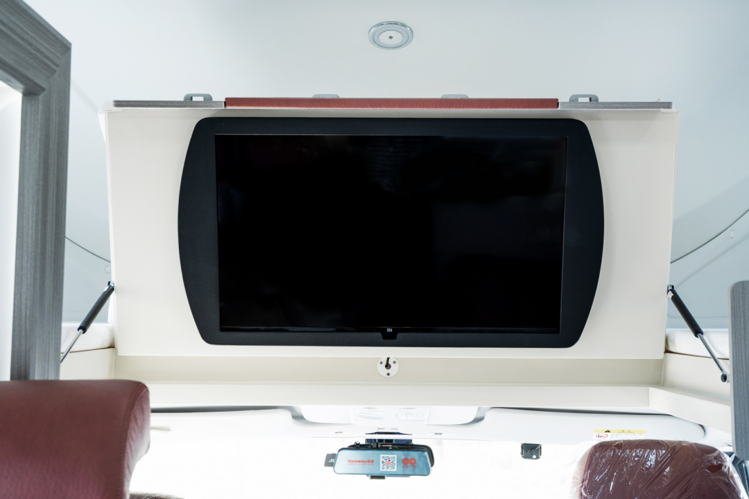额头休息区设有大尺寸双人床,是车内主要的睡眠休息区域;床面铺设有慢回弹海绵床垫,长期使用不变形,睡眠体验更佳;下方内嵌了一台32寸小米液晶电视,满足影音播放娱乐需求。