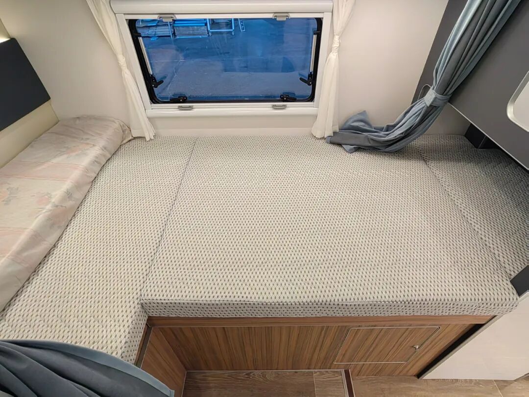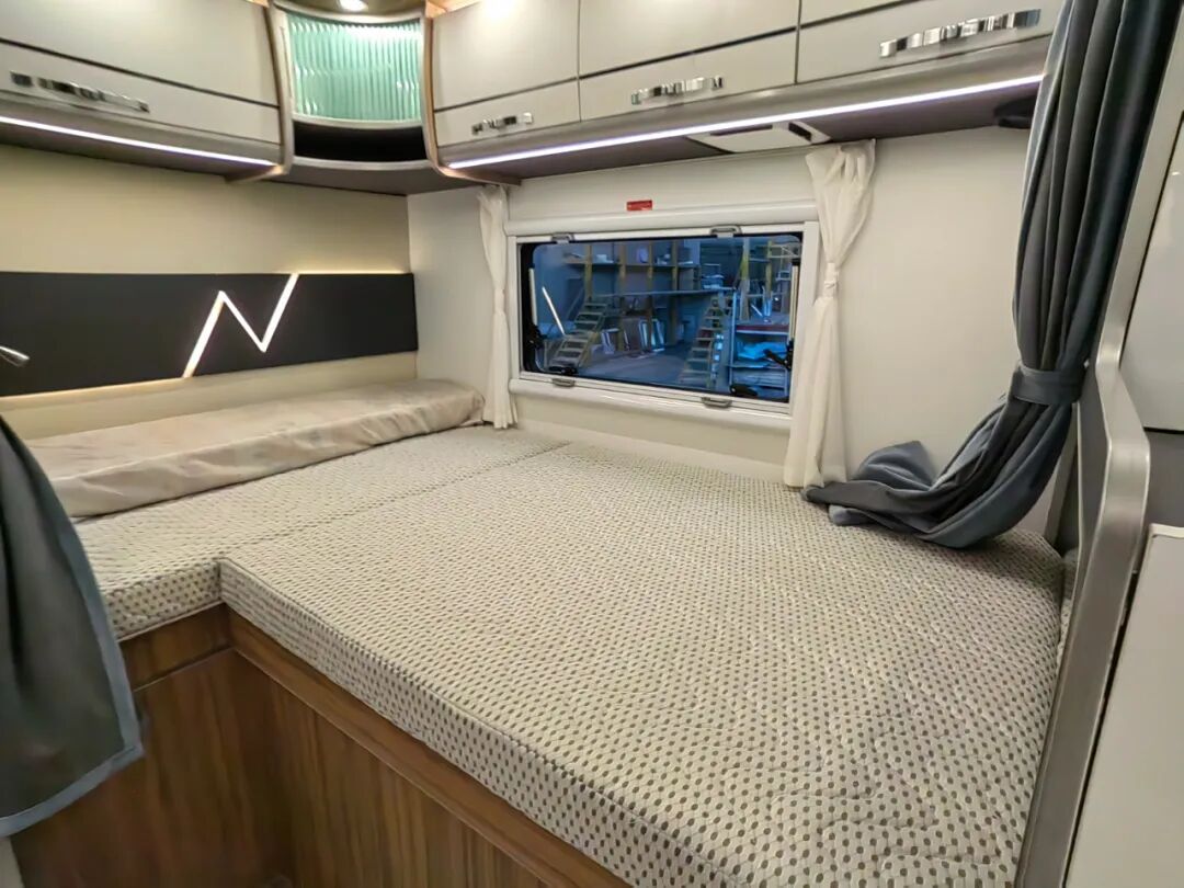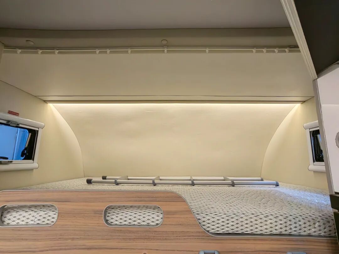 额头休息区设有翻转双人床,尺寸为1450x2000mm,供日常休息使用;两侧均设有车窗,保证休息空间空气流通;侧面设有阅读灯、220V插座、USB接口,满足睡眠休息的需求。