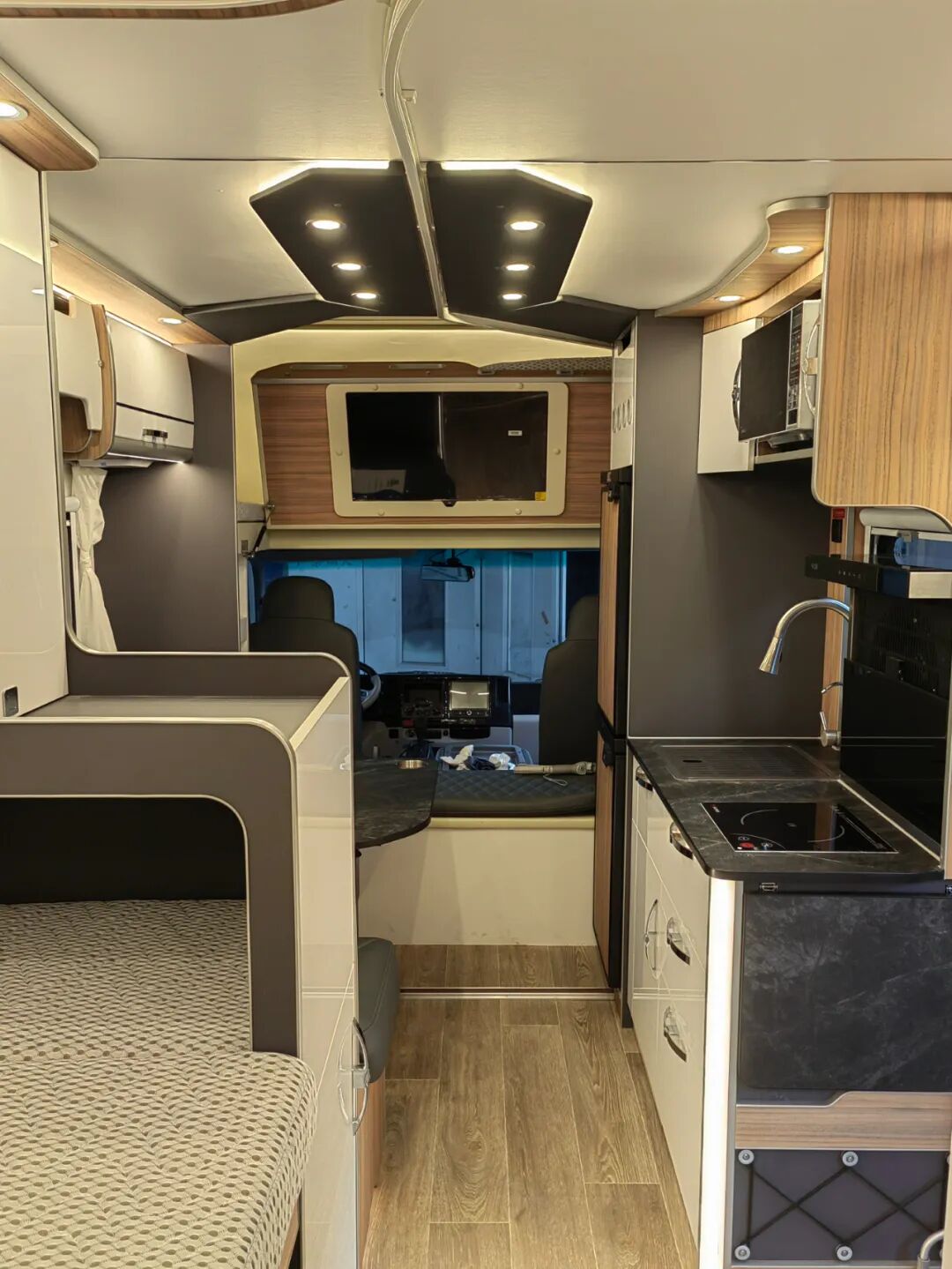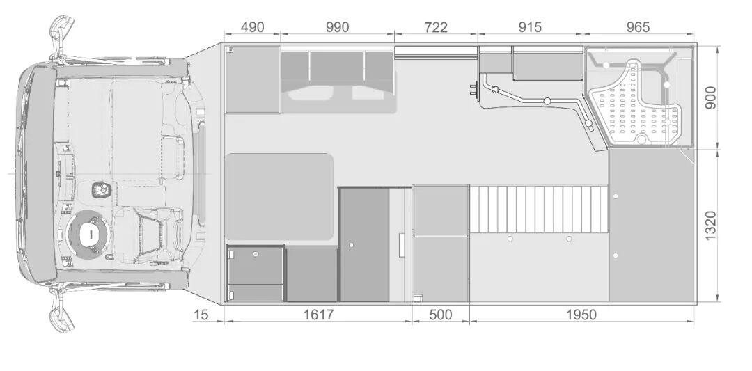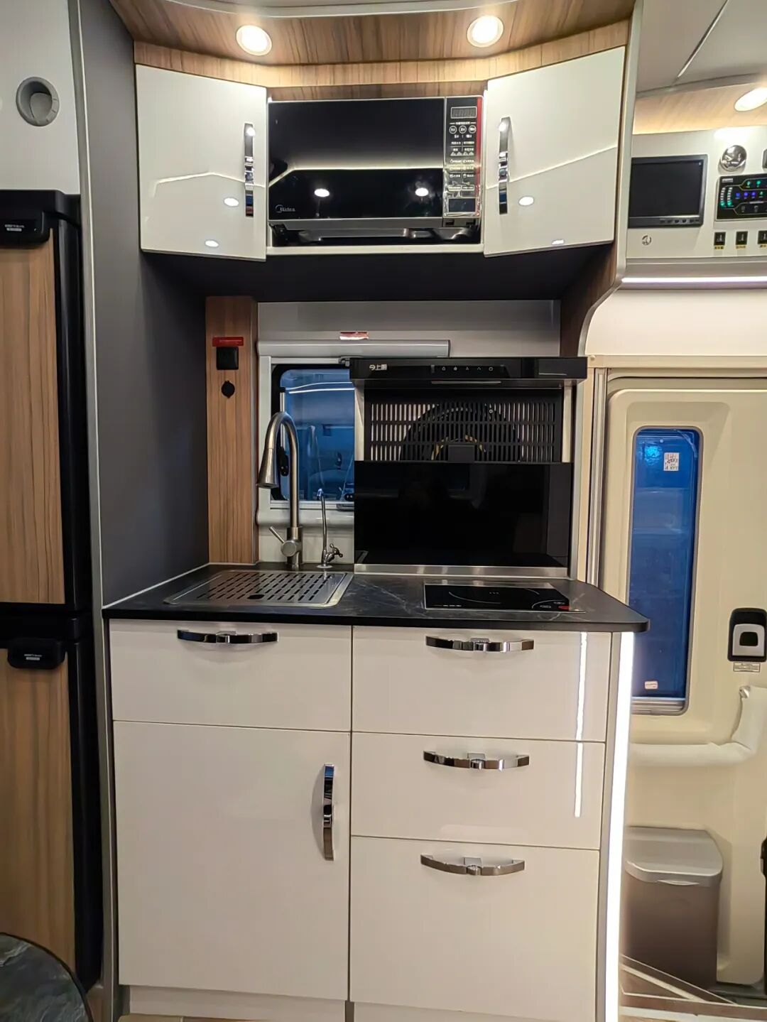厨房区设置了整体式橱柜,配备洗水槽、水龙头、微波炉、电磁炉、集成式下排抽油烟机等设施,解决户外旅行烹饪问题;橱柜左侧配有12V 152L冰箱,储存旅行生活所需食材。