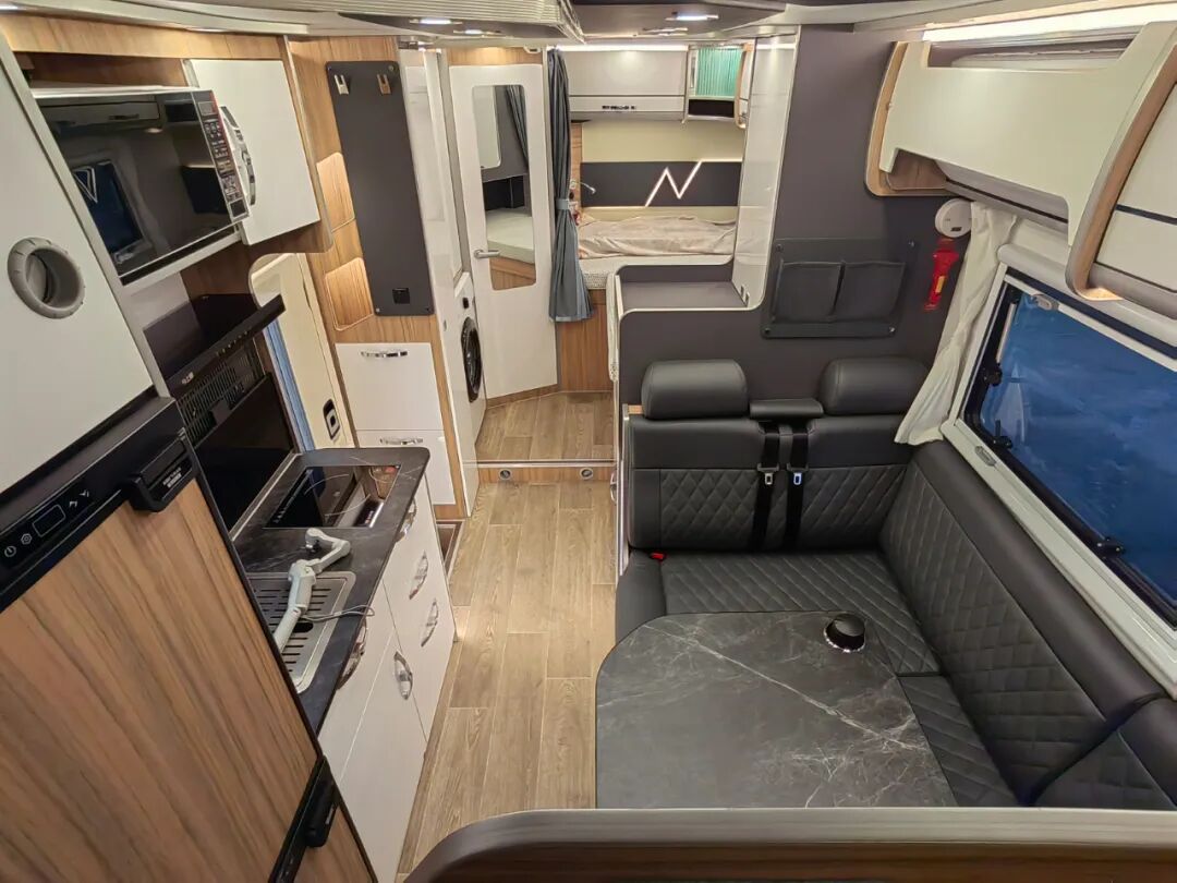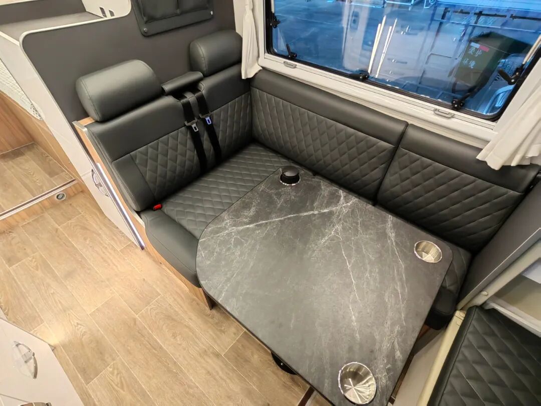 会客区设有L 型卡座,乘坐空间丰富,空间利用高效;卡座中间设有升降餐桌,供日常就餐、办公使用,也可与卡座拼床;侧面设置了大尺寸车窗,同时设有隐私帘,保证空间的私密性。