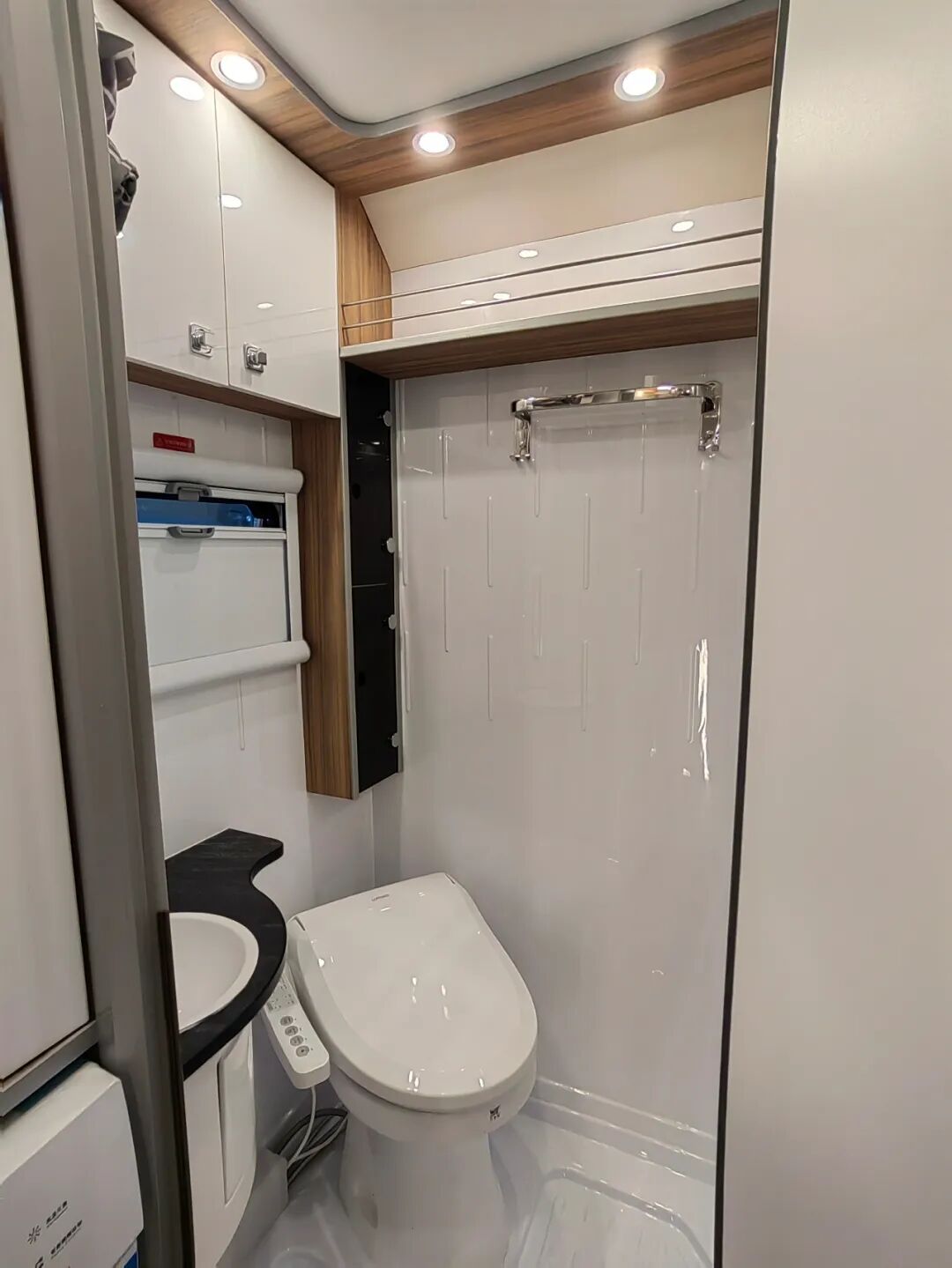 卫浴区采用吸塑一体工艺,整体性好,防水防潮性能出色;内部配备了洗手池、赛特福德盒式抽拉马桶、淋浴花洒、毛巾架、化妆镜、储物格等,满足日常卫浴、洗浴需求;顶部配备换气扇,保证内部空间空气清新。