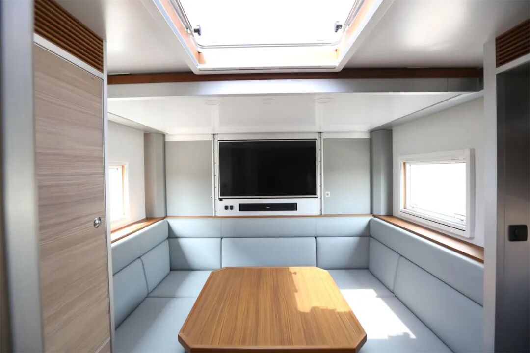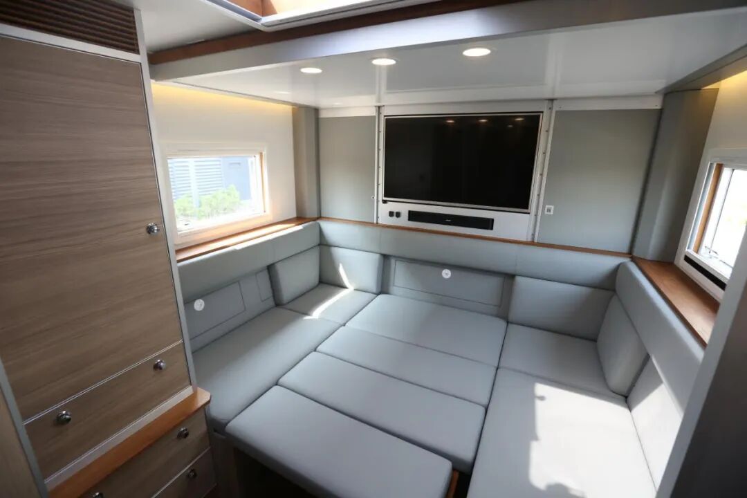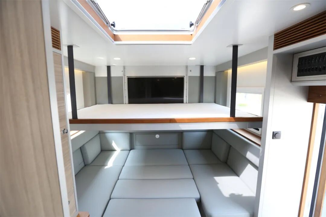 会客区设有U型沙发卡座,乘坐空间丰富,可满足多人乘坐休息;卡座可以拼成一张2000x1450mm沙发床,供日常休息使用;侧面设有液晶电视机,为旅行生活带来更多乐趣;顶部设有进口级游艇天窗,可内外开启,加强采光通风。