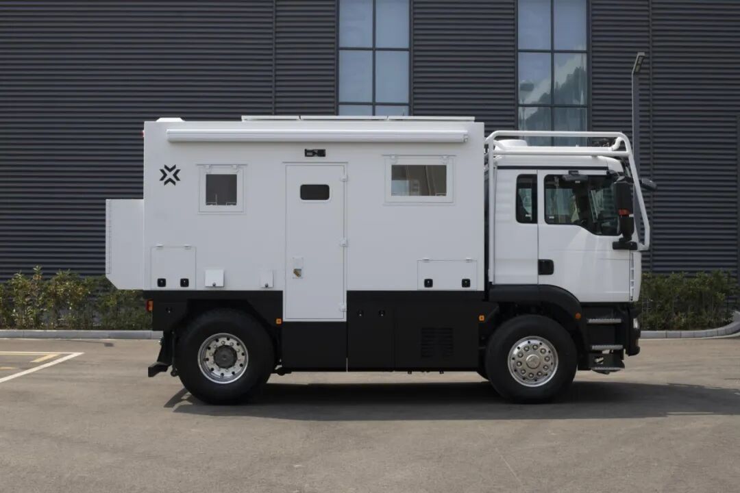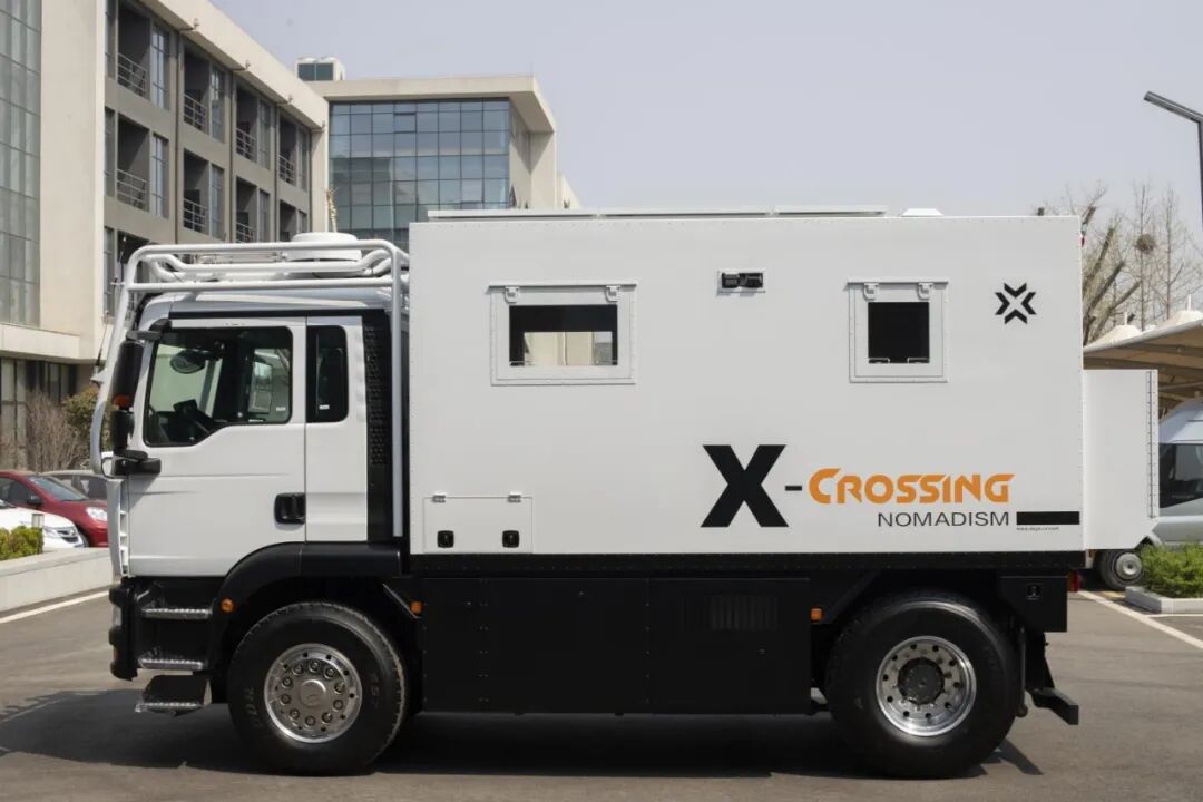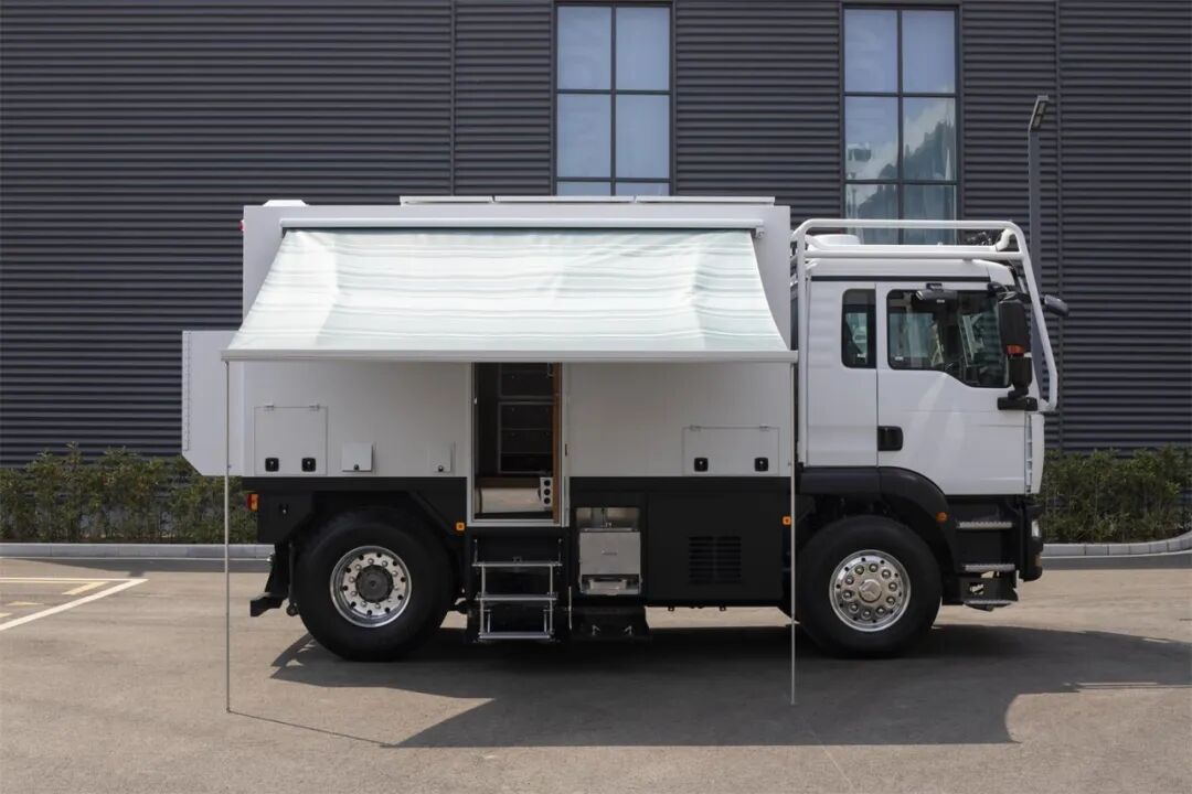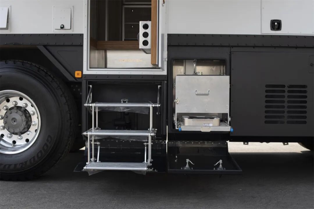 车身外侧配备户外遮阳蓬、市电接入口、室外用电接口、压力加水口、室外用水接口、四级踏步铝合金自动楼梯等,为旅行生活带来方便。
