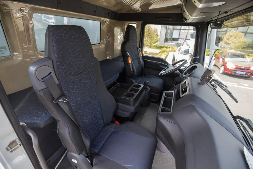 驾驶室主副驾驶座均配备空气悬挂座椅,可有效缓解久坐疲劳,乘坐体验更佳;后排设置了单人硬座硬卧,方便驾乘人员替换休息。