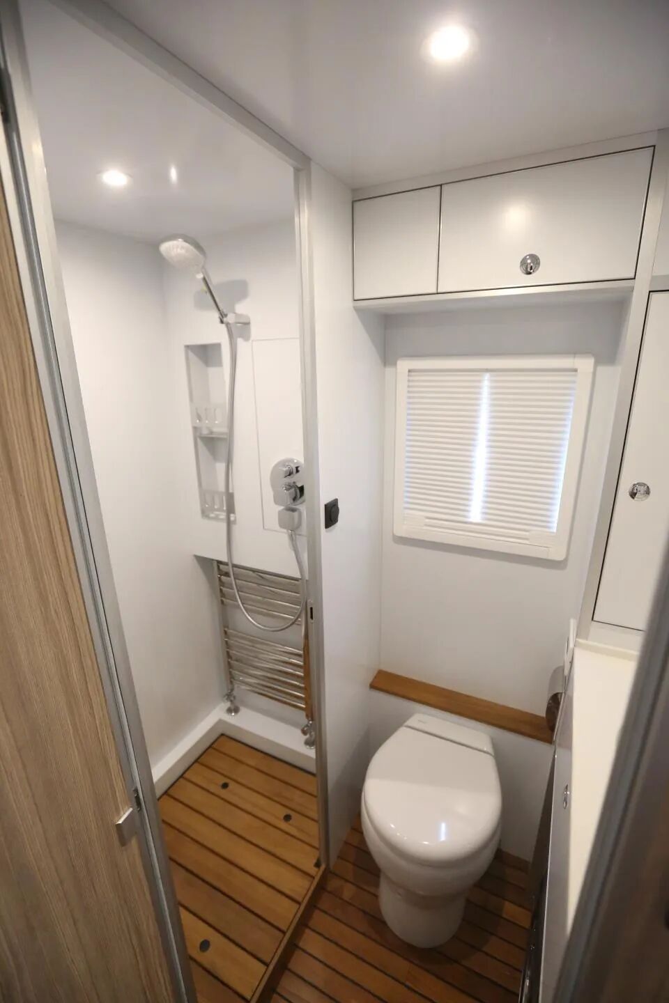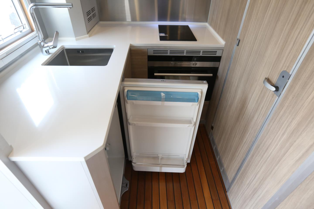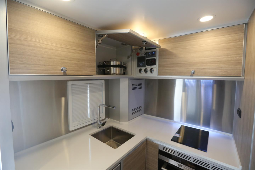 后方生活区没有设置固定休息区,为厨卫部分留出更大空间,旅行时洗漱、休息、烹饪更加方便;内饰选用船用级柚木地板,耐磨耐用,抗腐蚀性好,同时配有荷兰进口天窗、游艇级遮阳帘和防蚊网,打造品质旅行生活。