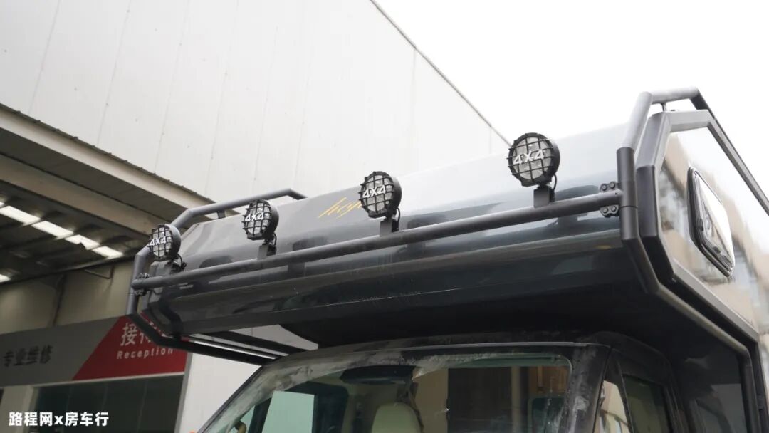 车顶与额头处装有防护栏,同时额头处还设有四个探照灯,使整车看起来格外硬朗,探险气息十足,还有浓郁的越野风铺面而来,兼具美观、实用的功效;