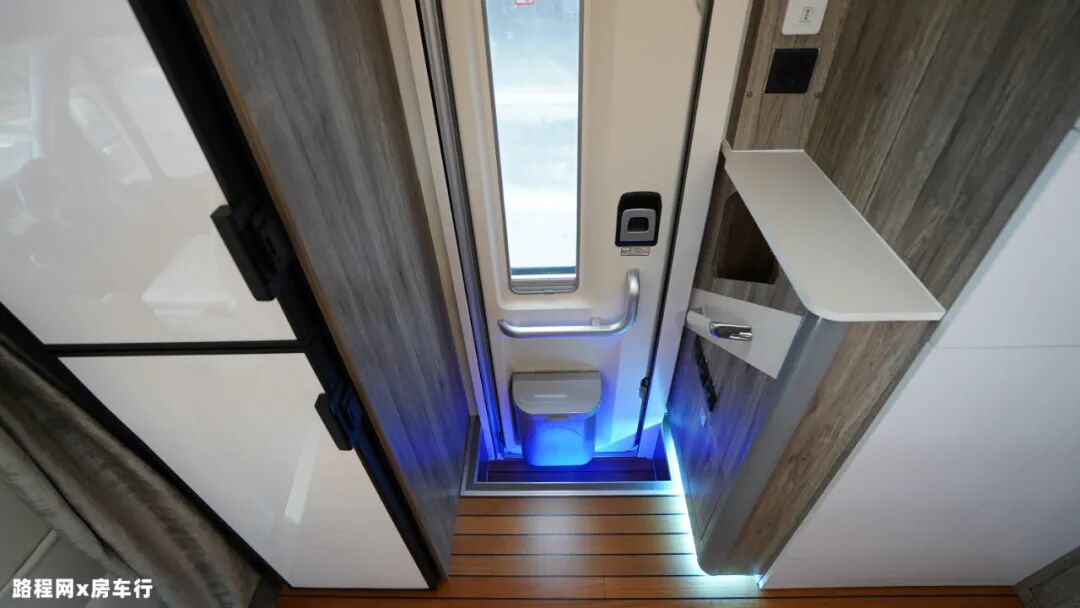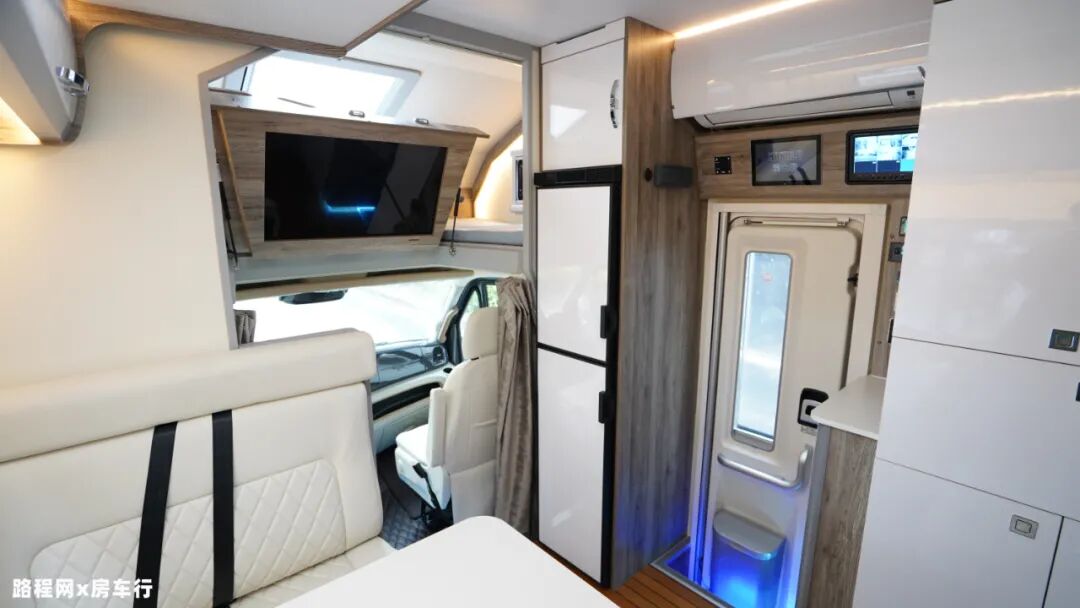中门入口处的配置也是相当的丰富,主门下方设有扶手方便上下车,底部装有车载小型垃圾桶便于日常生活垃圾的丢置;主门内部左侧装载一台阿雷娜185L冰箱,满足长期旅行时储存大量食材的需求;
