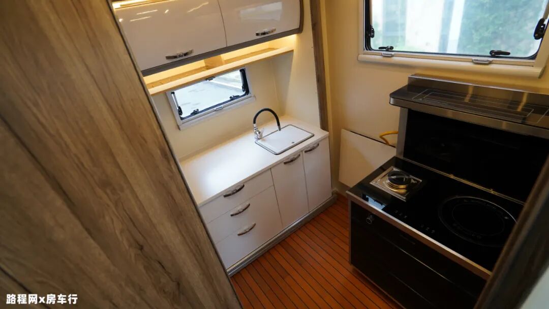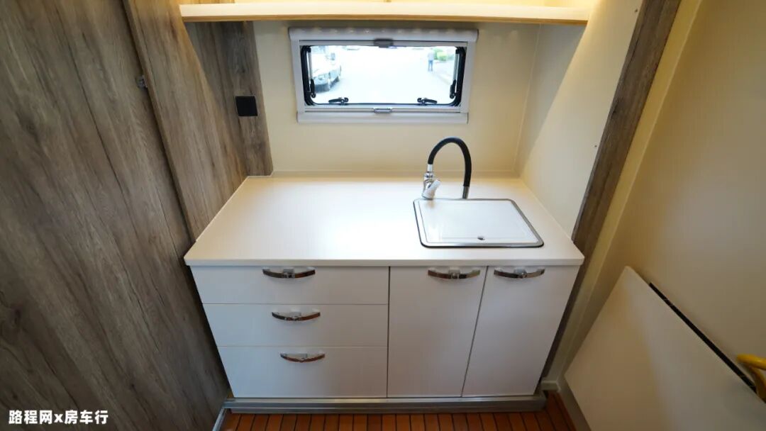 尾侧设有一体式橱柜,内部装载了房车专用洗菜池、独立水龙头、大空间储物柜、多组抽屉等设施;同时橱柜表面超大的操作台也进一步提升了日常烹饪时的操作空间;