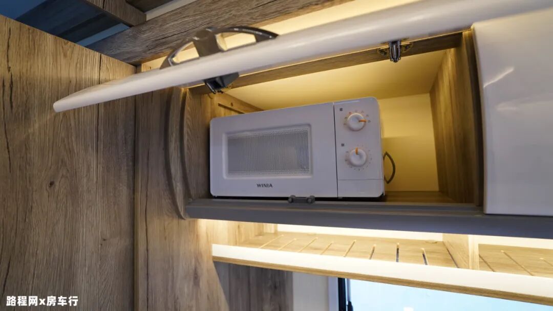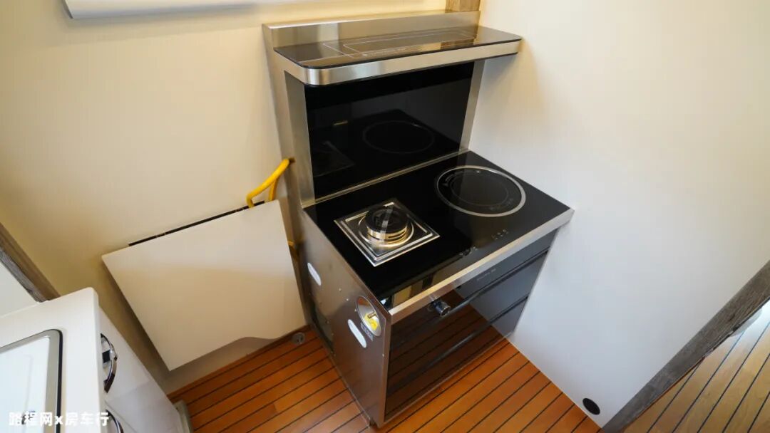 厨房区为封闭式设计,内部设施齐全,同时设有多个外推窗、顶部装有MAX换气扇方便日常通风换气;而在驻车拓展后,内部空间相当开阔,不妨大胆想象一下,驻车做饭时,最爱的人在身边,一人烹饪,一人准备食材、打打下手,那该是种什么体验?那是小编这种单身狗绝对无法想象的快乐啊...哭...