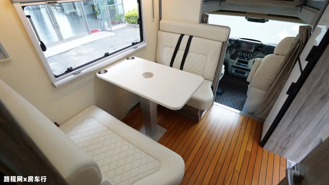 会客区在车内左侧区域,内部配置了双人对向卡座沙发,中间设有带有杯托可升降式餐桌,满足日常休闲、会客的需求;侧方配有大型外推窗,实际体验中采光、通风效果相当不错,同时较大的面积用于日常观赏风景亦是不错的体验;此外,驻车休息时,对座座椅可与升降餐桌组合拼床,可供临时睡眠使用;