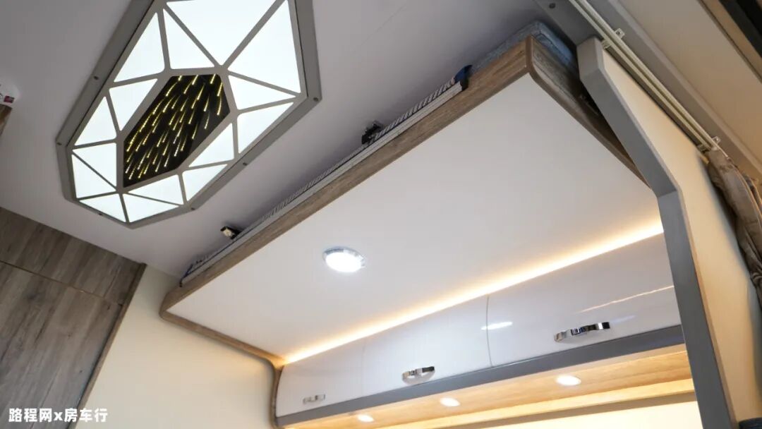 对向双人卡座上方还设有一张电动升降式单人吊床,进一步增加车内睡眠空间,即使多人出行也不用担心没地方睡;吊床下方设有多组储物柜,存取物品相当便利;同时设有阅读灯、照明灯、行李舱照明灯方便日常生活使用;