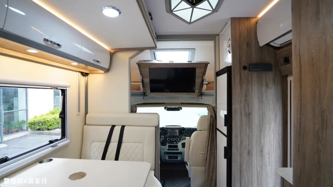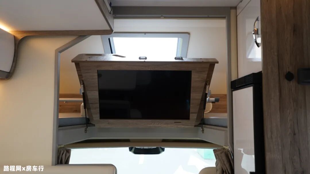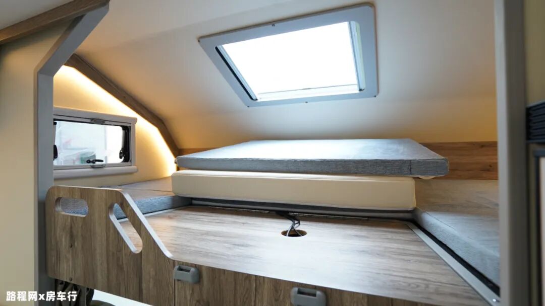 驻车时将车载电视放下即可转化为额头休息区,内部设有一张双人床,满足多人睡眠的需求;同时额头处封闭式天窗、两侧外推窗的设计加强了日常采光、通风的需求,日常居住睡眠体验还是相当舒服的,不会有压抑的感觉;