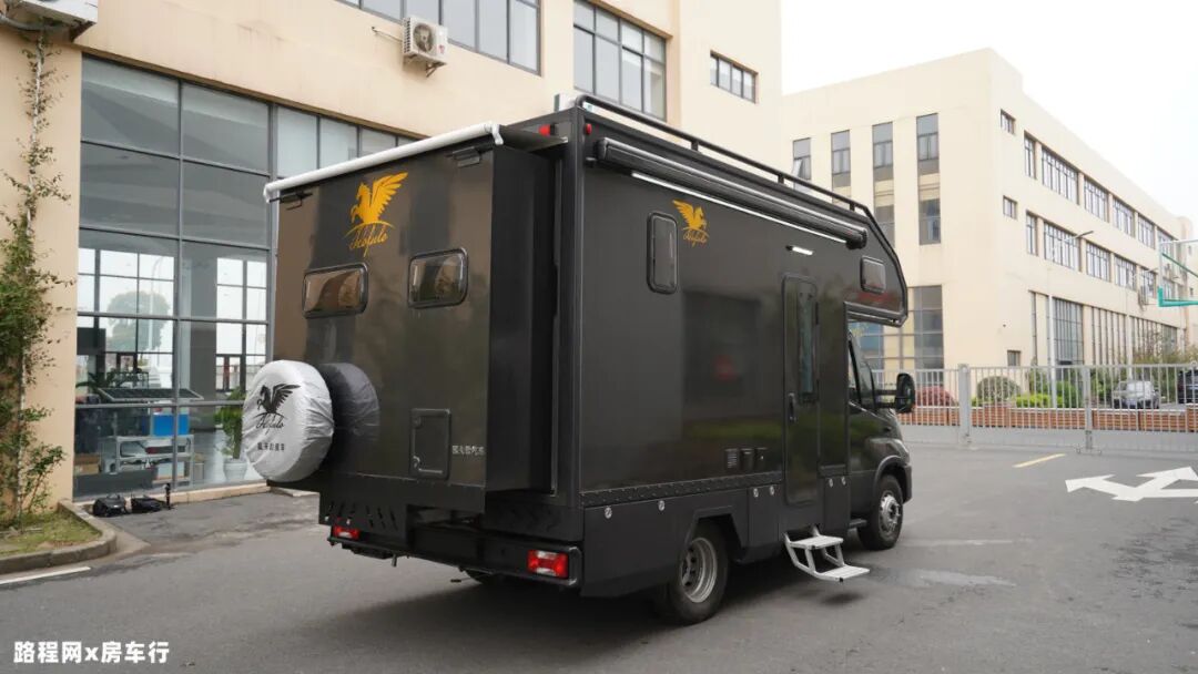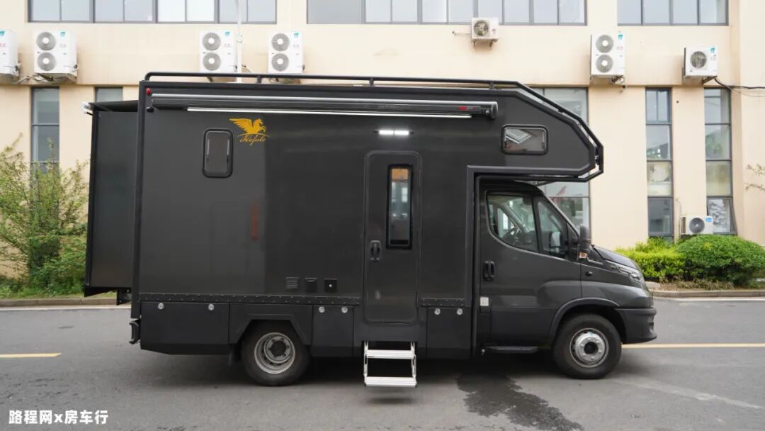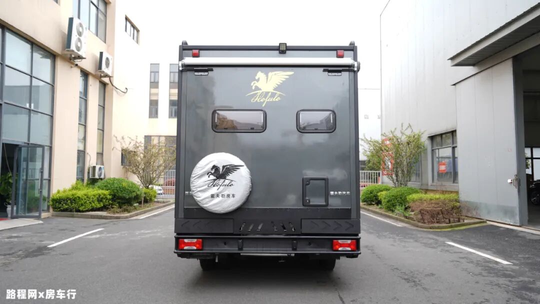 首先来看一下它的外观,新车在外观上延续了启翔系列浓郁的越野风格,暗夜黑车漆包裹车身表面,如黑夜般神秘深邃,车厢侧面有金色天马点缀其上,使新款房车看起来更加美观的同时也给它增添了几分活力;整车的车身外尺寸为5990x2490x3370mm,核载6人,上蓝牌,C照即可驾驶;