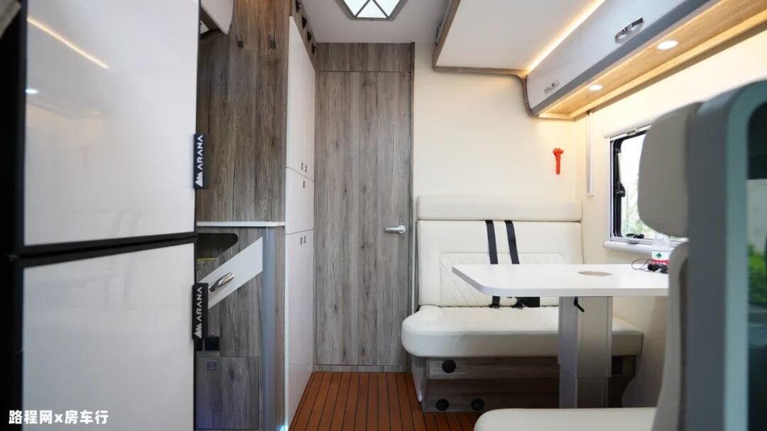 车内生活区底部整体选用实木地板铺设,逼格满满,耐磨损,加强实用性的同时也给内部营造豪华舒适的感观体验;重头戏在车厢尾部,内部为独立厨房区与卫浴区所在,与生活区连接处设有木质门板进行隔断处理,有效避免内部油烟、异味进入生活区,看到这里,你想到了什么?对,没错,相比一般的房车,这款车更像是一间可以移动的一室户,还是带有独立厨卫的那种,让你在旅居生活中也能享受到家一般的舒适;