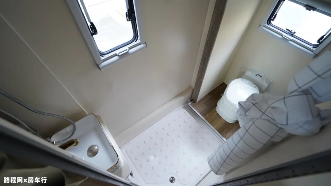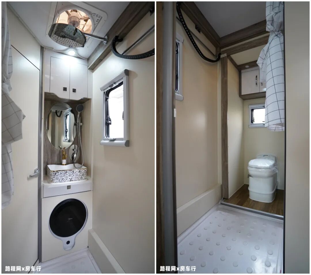 尾部左侧为独立的卫浴区,驻车拓展后,卫浴区内部空间也是相当充足的,同时设有防水浴帘进行了简单的干湿分离;配置也是相当的齐全,为满足日常使用需求,内部设有赛特福德盒式马桶、洗漱池(台上盆)、浴镜、储物柜、外推窗、毛巾架等设施;顶置电动雨感排风扇加强内部通风效果;洗手池下方内嵌一台3KG美的洗衣机;另外值得一提的是,相比一般房车,这款房车的卫浴间设计了两个独立的淋浴花洒,中部固定大尺寸淋浴花洒、洗漱台上方固定/手携式独立淋浴花洒,满足你对沐浴的不同使用需求;