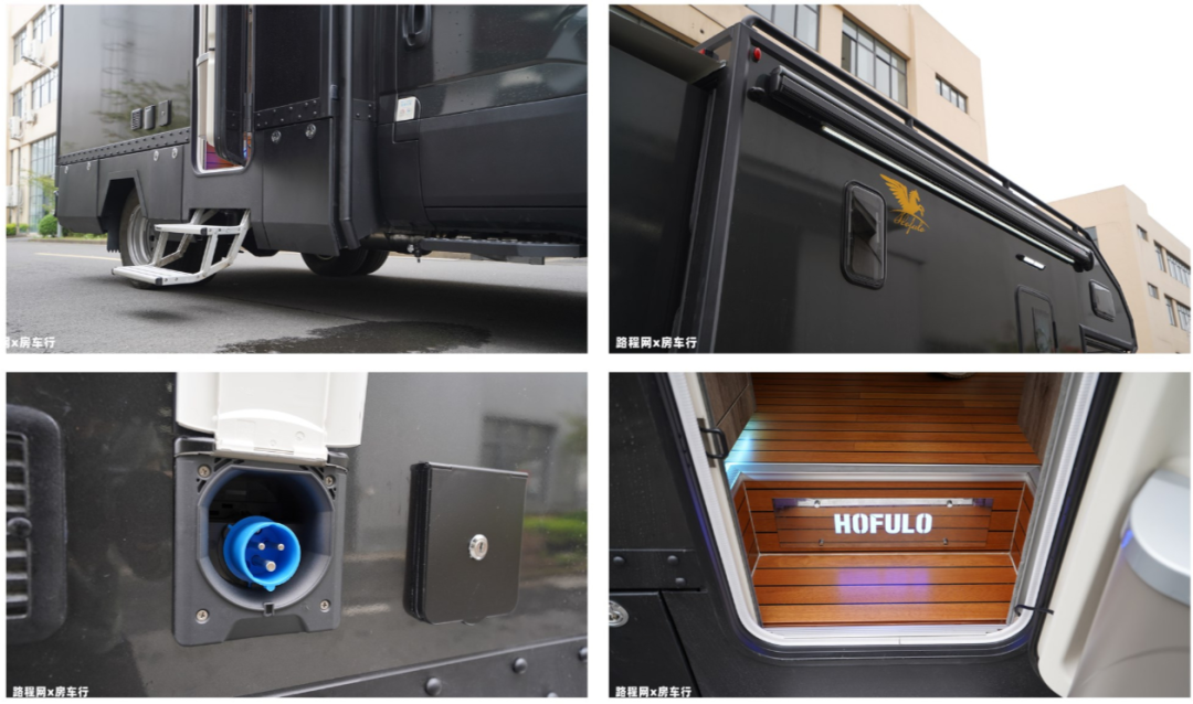车身右侧设有房车专用乘客门,同时配置纱门可有效防止蚊虫的侵扰;外部设有3.5M电动遮阳棚(菲亚玛)、户外抽拉灶、电动二阶踏板、重力+自吸带锁加水口、25M 外接加水套件、房车专用外接水龙头、外接电源插座/15米市电线外接电源输出插座、户外照明灯、前后防撞雷达、电动驻车支腿等多种设施,方便旅居生活中日常驻车使用;