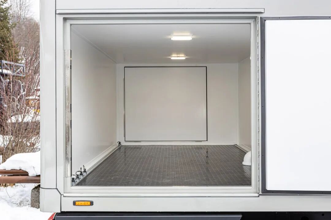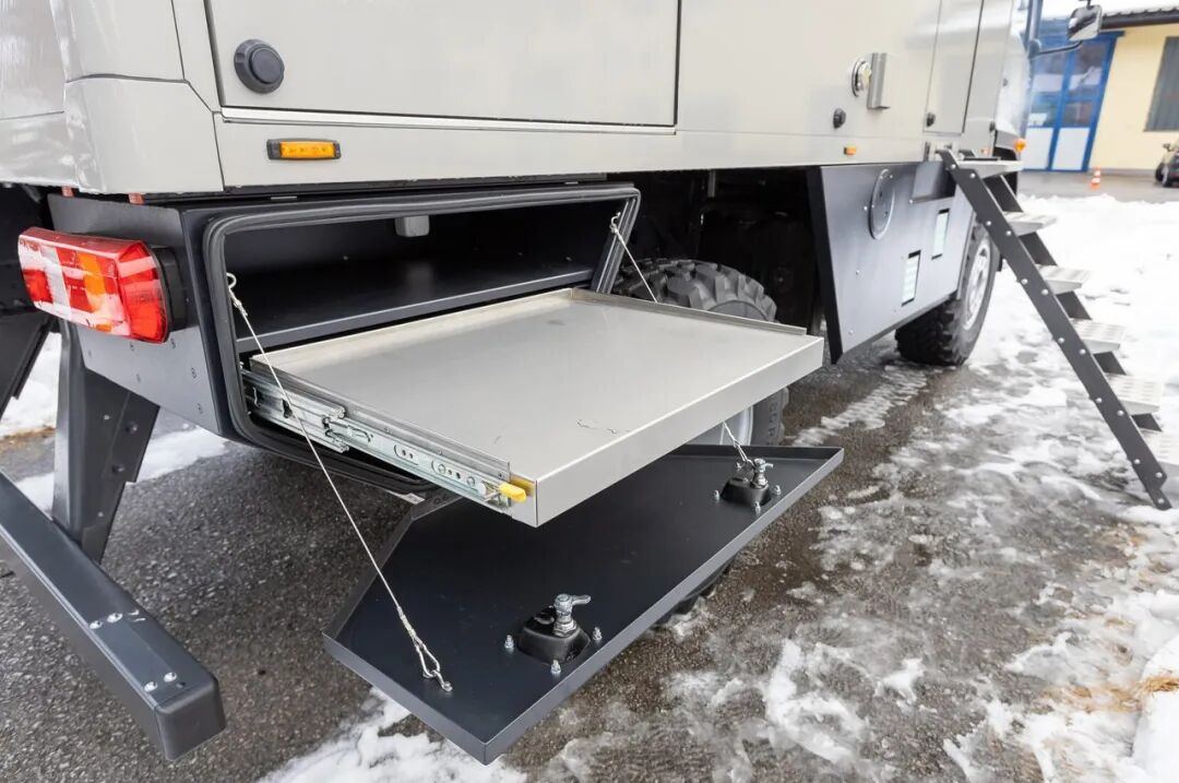 车身右侧设置了超大空间储物舱,采用平舱门设计,储物更加方便;顶部还设置了两个照明灯,方便夜间取用物品;储物舱下方是抽拉折叠板,户外烹饪时可以放置食材等物品。
