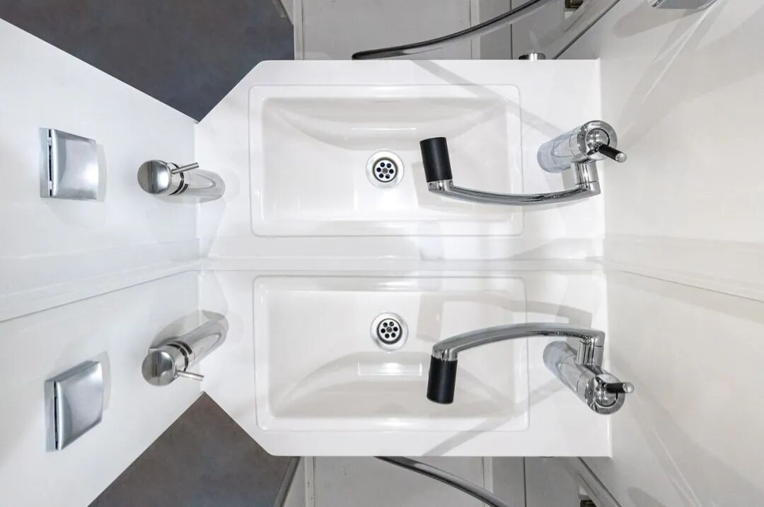 卫生间设置在车身前部,设置了一个干燥的马桶、淋浴花洒和一个带水龙头的洗水盆,解决旅行生活的卫浴、洗漱问题。