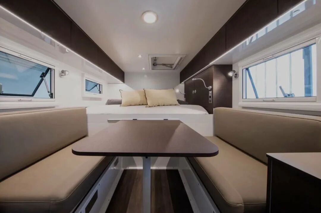 会客区紧邻厨房区,设置了对坐式卡座,乘坐空间丰富;卡座中间是可升降餐桌,与卡座可以拼床,作为临时休息区使用;两侧均设有大尺寸外推窗,采光通风效果良好。
