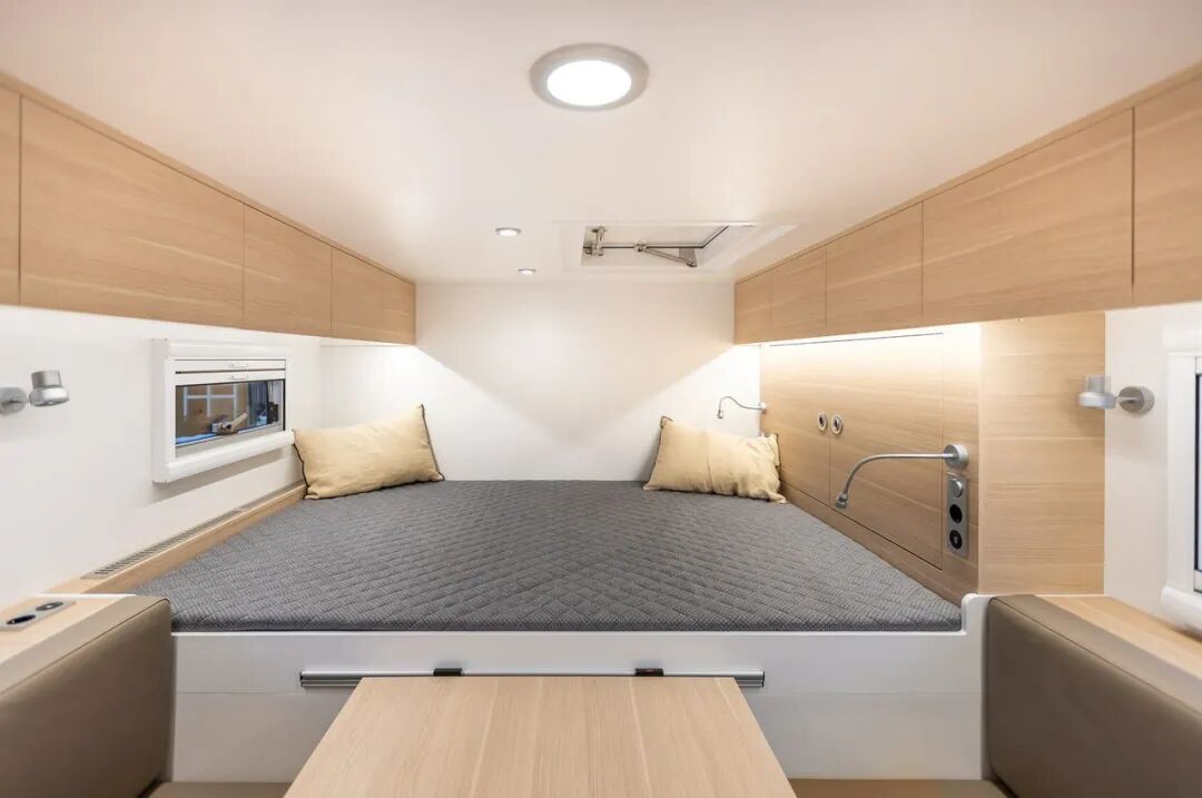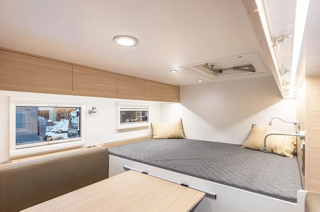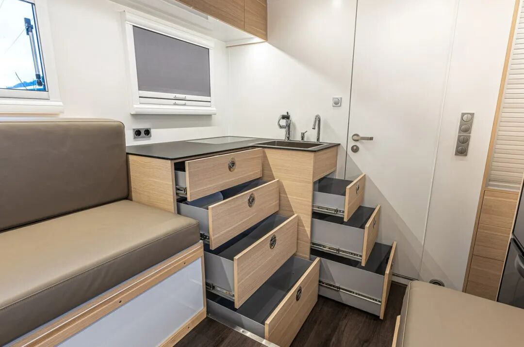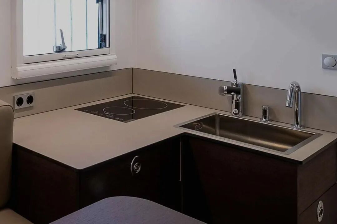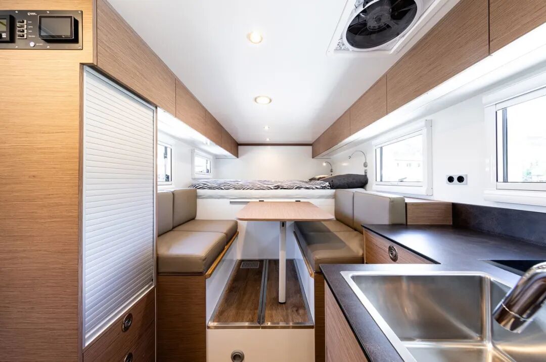 打开乘客门,首先看到的是厨房区,内部设置了L型橱柜,水龙头、洗水槽、电磁炉等烹饪设施配备齐全;侧面设置了大尺寸车窗,既保证了日常采光,也方便烹饪时散去车内油烟味;橱柜对侧的是140升的Vitrifrigo冰箱,可以存放充足的食材。
