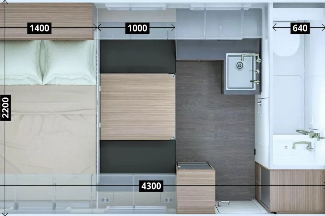 车内生活空间设计简洁,依次设置了卫生间、厨房、沙发、双人床,满足旅行生活的需求。