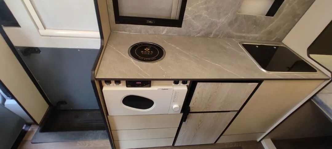 厨房区采用一体式橱柜设计,内部集成了电磁炉、90L冰箱、洗菜池、储物抽屉等设施便于车内烹饪;较大的操作台面处理、放置食材也更为方便。