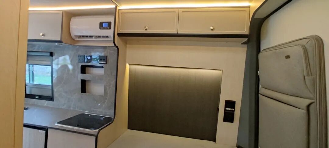 橱柜墙面设有储物格,可用于放置调味品;上方搭载12V房车专用直流变频空调,确保生活区始终处于适宜的温度。