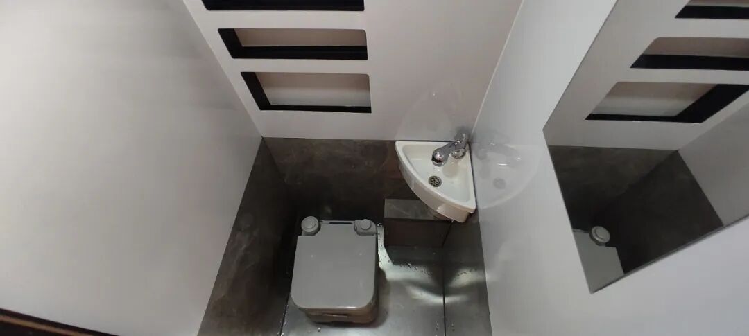 内部干湿一体,空间方面表现不错,并配备了便携式马桶(可选装三乔抽拉式马桶)、淋浴花洒套件、洗漱池、浴镜、置物格、排风扇等,满足旅居过程中洗漱、卫浴的需求。