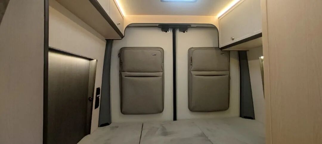 尾置横床尺寸为1860X1230mm,满足多人睡眠需求;左右两侧上方搭载多组储物柜,尾部两个房车专用储物袋,储物空间丰富。