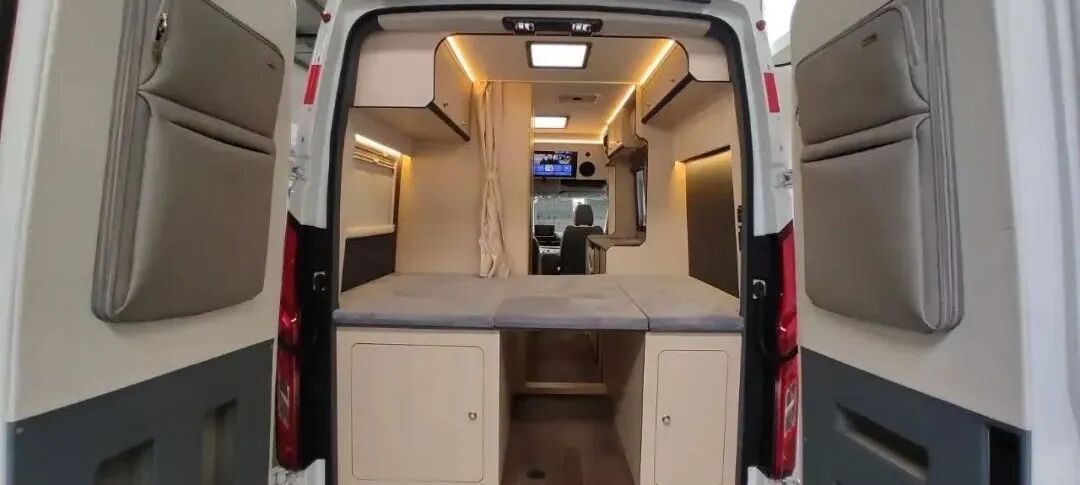 尾床贯通式设计同样是一大亮点,在不需要休息时,可将中间床板放置到一旁,贯通式过道便于进出生活区;底部设有两个储物柜,方便放置大件行李。