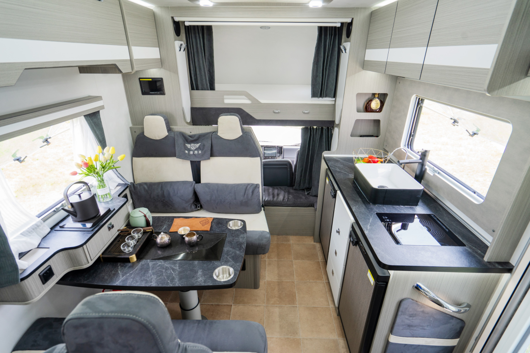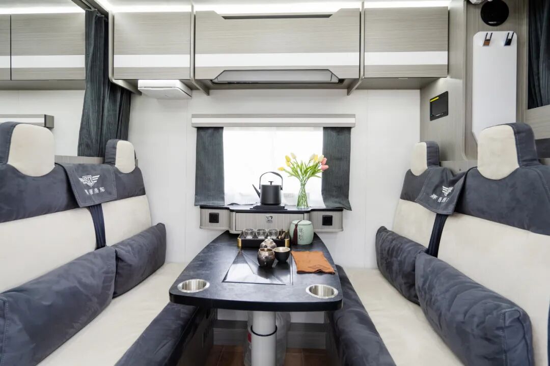 会客区设有对向沙发卡座,中间是可升降餐桌,满足日常就餐、办公、乘坐休息的需求;餐桌侧面是泡茶台桌,集休闲商务为一体,带来更舒适惬意的享受;顶部配有1.5匹格力空调,用于调节车内温度。