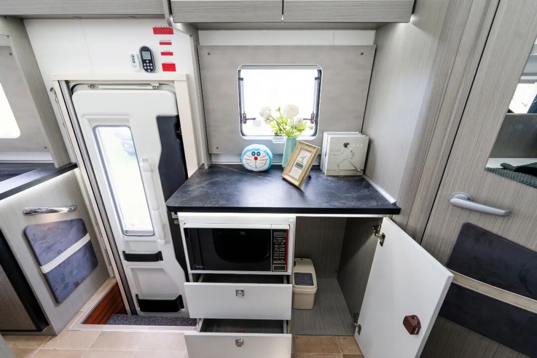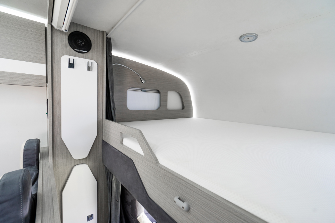 尾置纵床尺寸为2000x1100mm,可满足多人睡眠休息;下方内嵌了3KG莫博洗烘一体机,解决户外旅行洗衣问题;侧面设有封闭式床帘,保证了睡眠空间的私密性;顶部还设有L型吊柜,储物空间丰富,轻松收纳日常衣物用品。