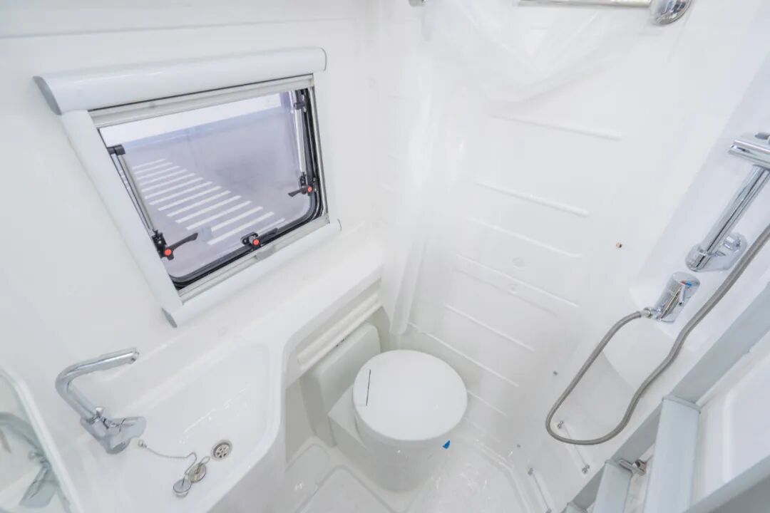 独立卫浴区采用吸塑一体式设计,防水、防潮效果出色,清洁、打理也非常方便;内部配备了洗手池、水龙头、淋浴花洒、盒式坐便器、毛巾架等,日常卫浴、洗漱没有任何问题。