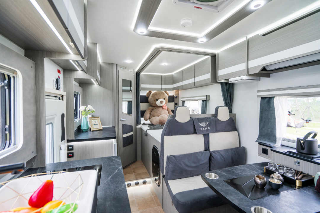 生活区地面铺设PVC地板革,环保健康,同时耐磨耐用;内饰采用了典雅清新的配色,营造出平淡素雅的生活氛围;照明方面配备了24V LED照明灯和氛围灯,为旅行生活提供照明支持;生活方面配有9000W高原版热水系统和暖风系统。