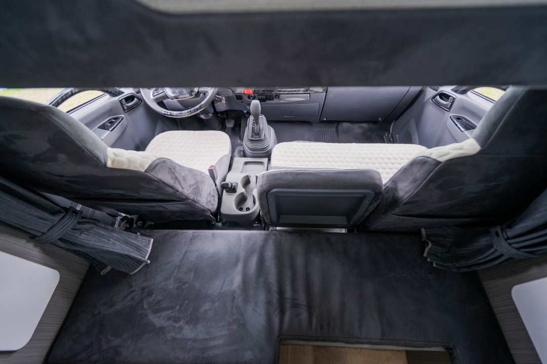 驾驶室和后方生活区设有可供交流沟通的空间,可与后方乘坐人员交谈;驾驶座椅后方还设置了榻榻米,可以乘坐休息。