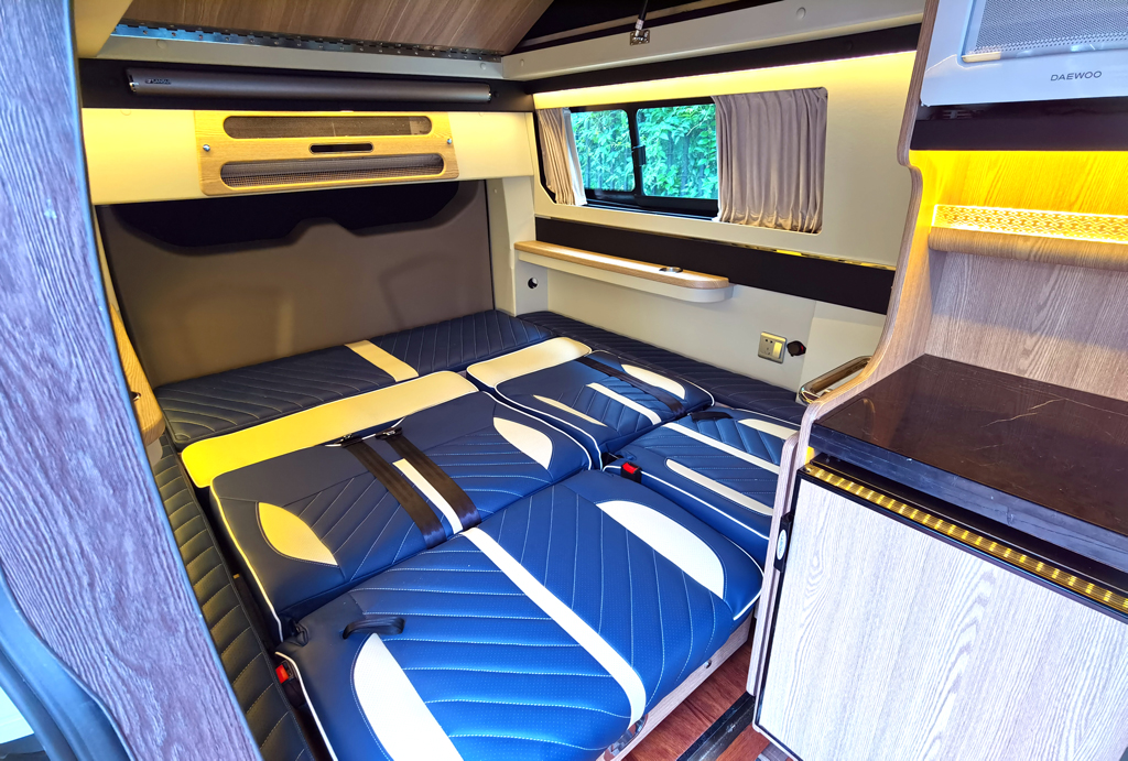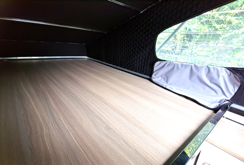 沙发上方的升顶系统还设置了一张床铺,床面比较平整,睡起来更舒适,两侧还带有可开启的车窗,保证空间的采光通风。